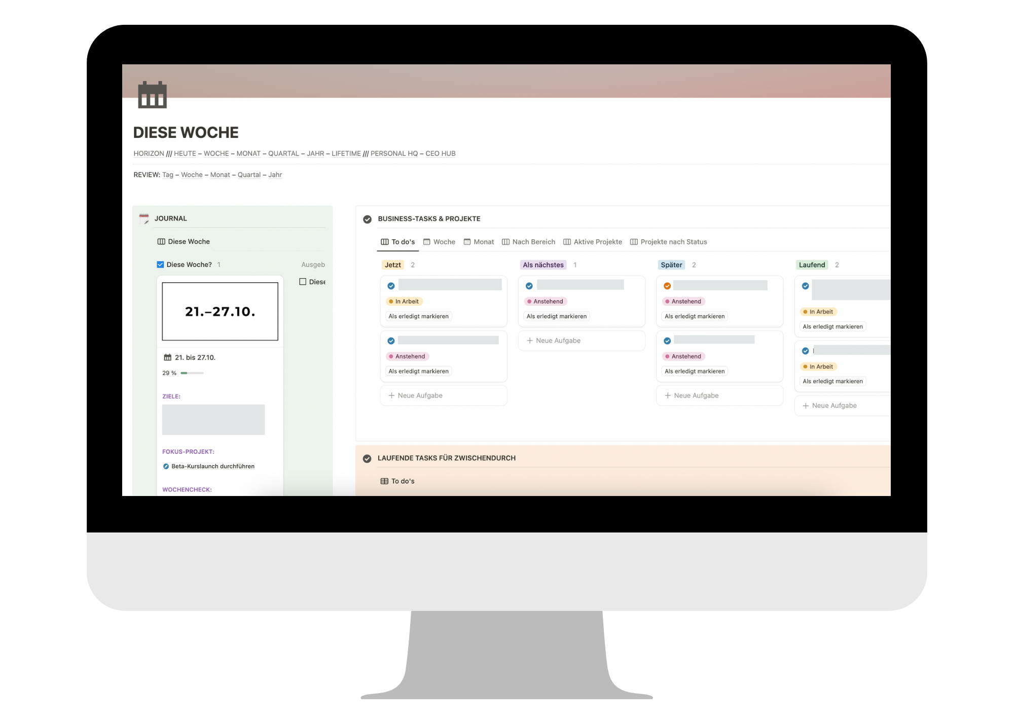 Entwickle jetzt dein maßgeschneidertes Produktivitätssystem! Du lernst, wie wir unseren Notion-Workspace strukturieren und wie du ein System aufbaust, das perfekt zu deiner Arbeitsweise und deinem Business passt.