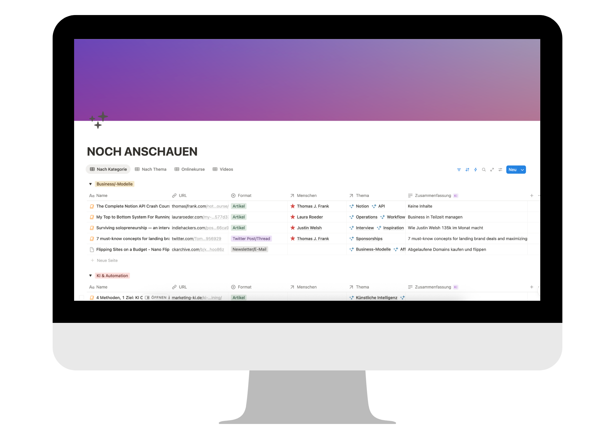 Was mir am meisten gebracht hat, ist es, nun im Notion-"System" zu denken und so die "Inhalte" meiner Arbeiten ganz anders, und deutlich übersichtlicher, zu strukturieren.