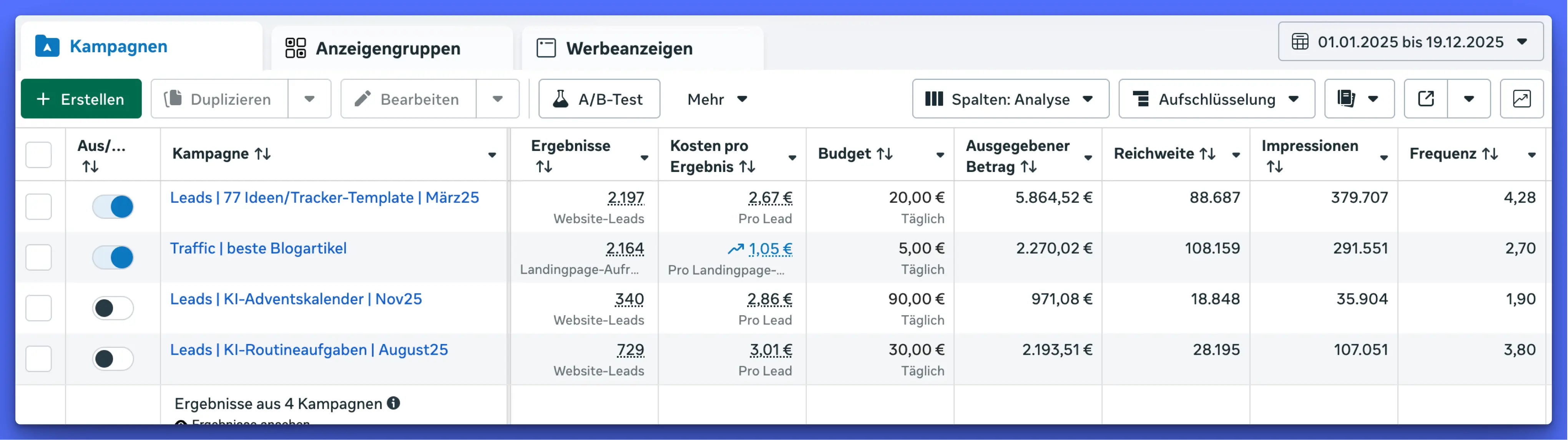 Ich bin weit weg von Ads-Profi und hab bisher hauptsächlich ganz simple Lead-Kampagnen für meine Freebies geschaltet, aber irgendwo muss man ja anfangen.