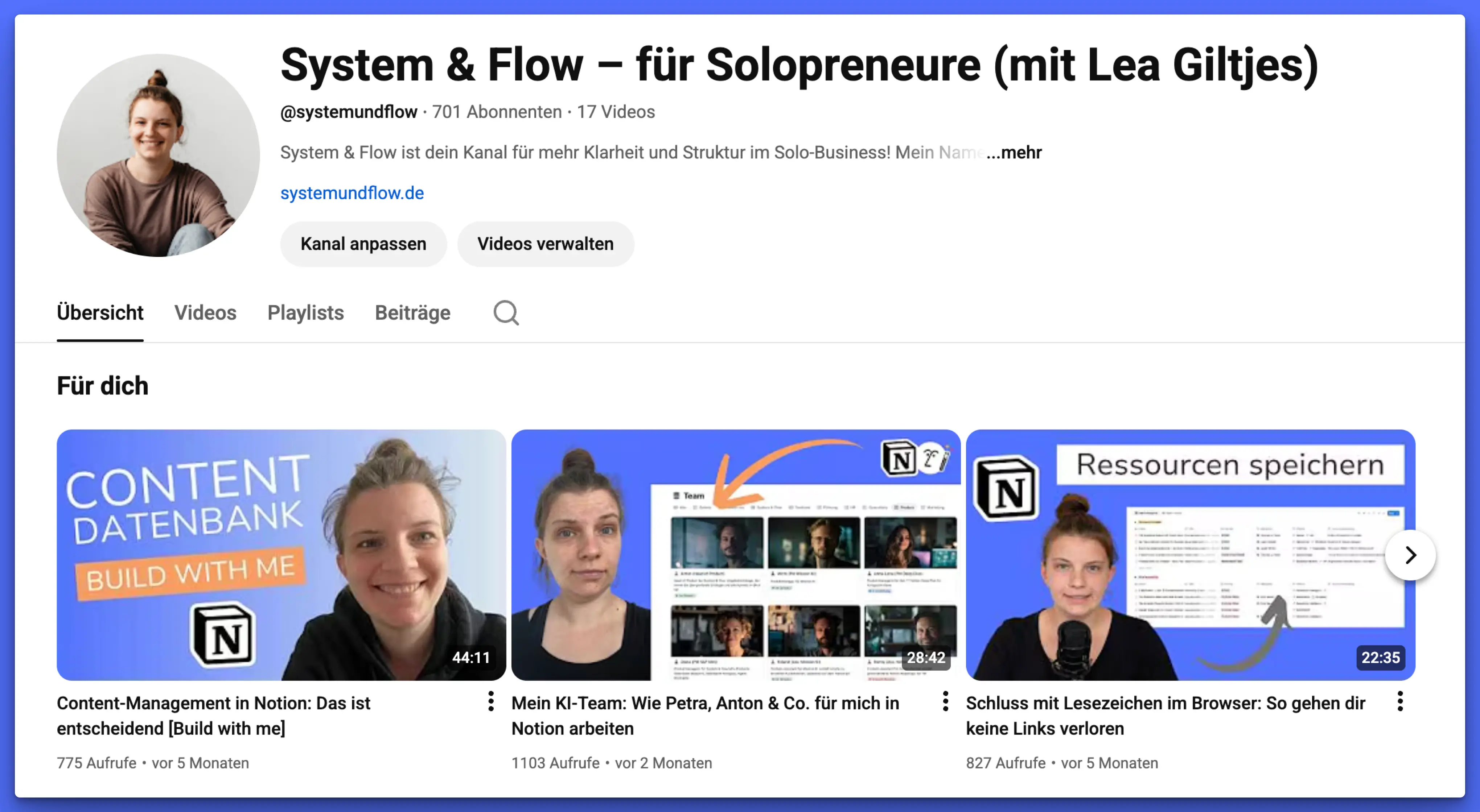 - Bei System & Flow geht es weiterhin um Notion, aber eben nicht nur. Stattdessen geht es um das, was dahinterliegt: Solopreneuren dabei zu helfen, ihr Business effizient und gleichzeitig entspannt zu führen. Das geht mit einem guten Notion-Setup, aber eben auch mit den richtigen KI-Workflows.