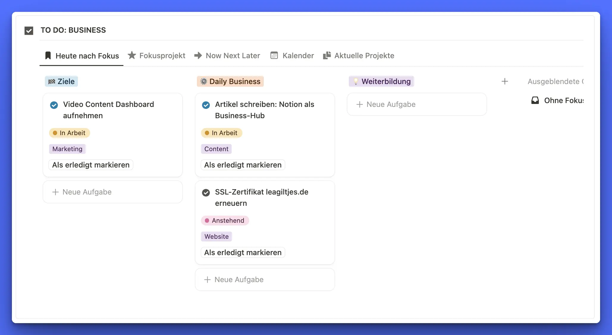 - In deinen regelmäßigen Reviews, die du direkt in Notion durchführst, taucht das Projekt immer auf, sodass du den Fortschritt überwachen kannst und es nicht aus den Augen verlierst.