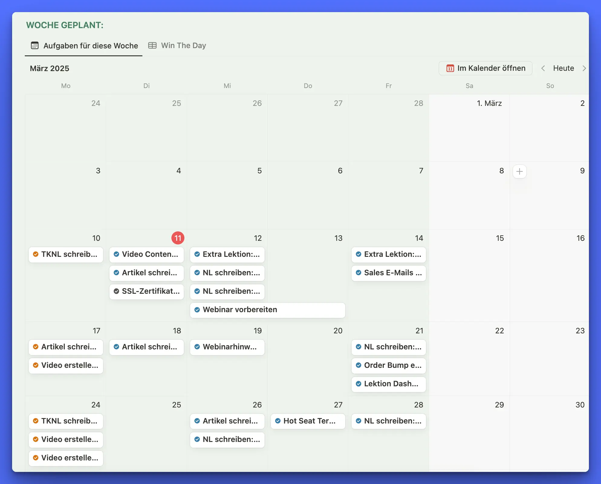 Im Zuge deiner Wochenplanung nutzt du vielleicht eine Kalenderansicht, um den Überblick zu behalten, was du dir für welchen Tag vorgenommen hast: