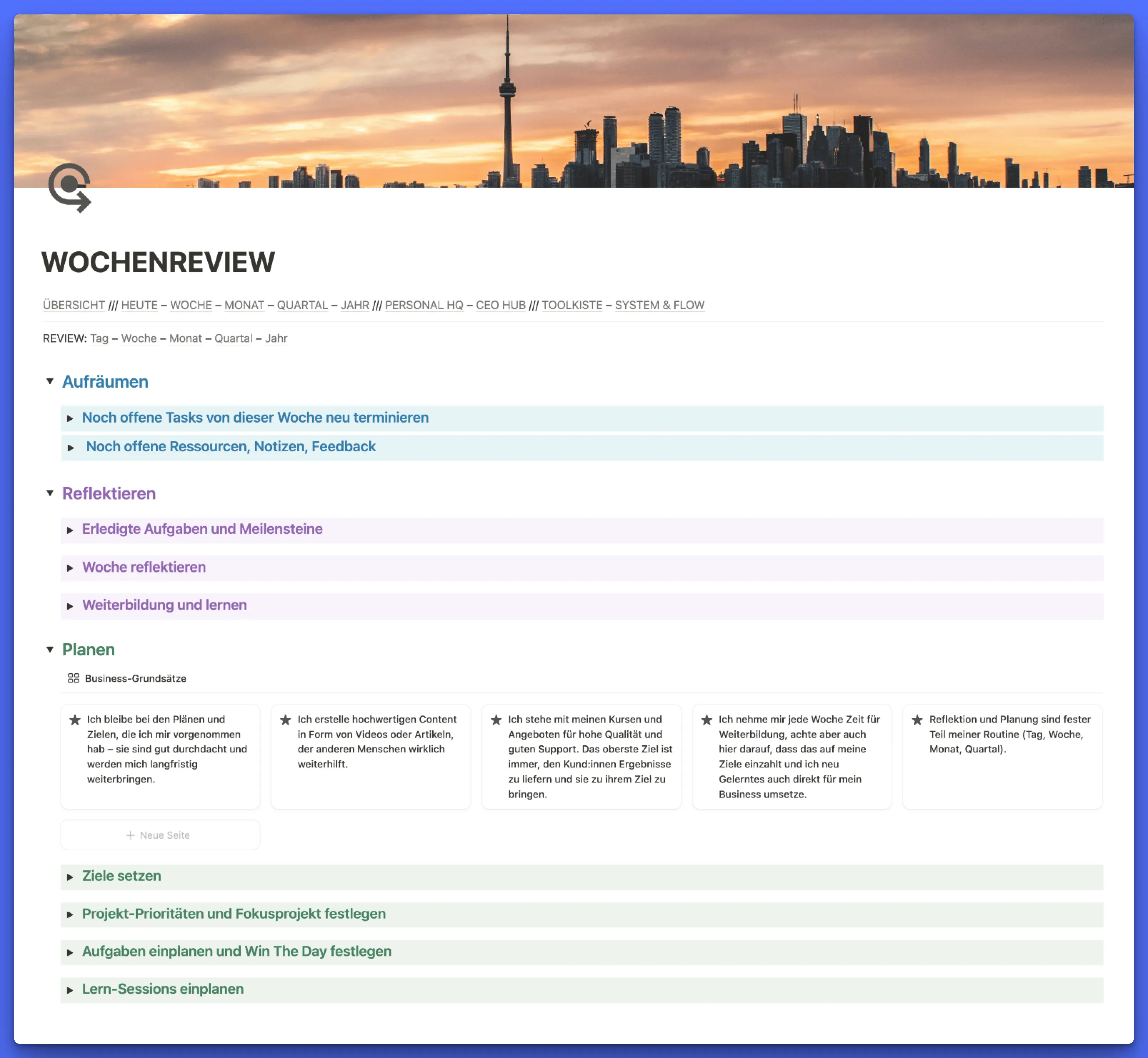 In einem effektiven Notion-Hub baust du regelmäßige Reviews direkt ein – tägliche Check-ins, wöchentliche Planungen, monatliche und quartalsweise Reflektionen.