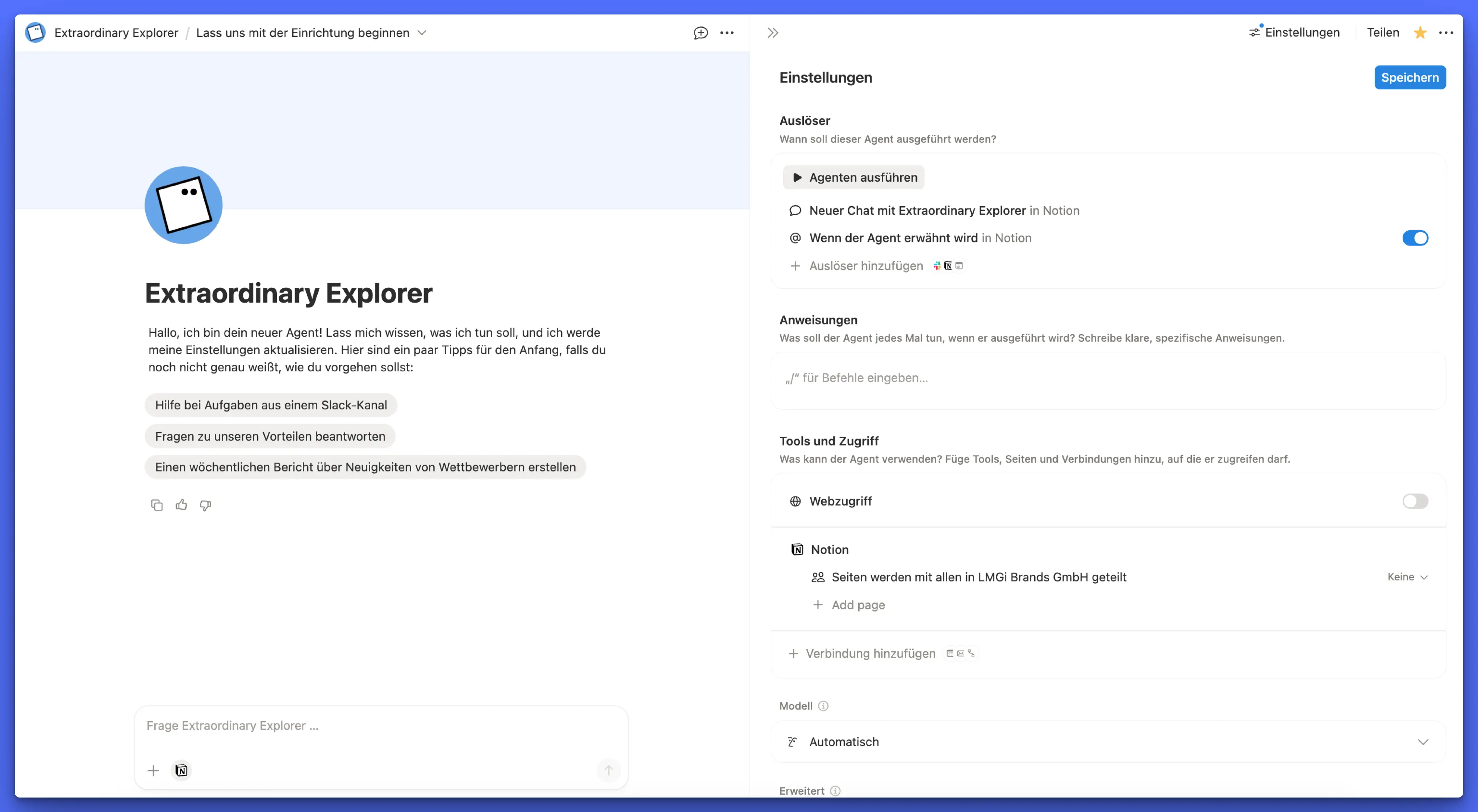 Wenn du im Team arbeitest, kannst du Custom Agents mit anderen Workspace-Mitgliedern teilen. Dabei gibt es eine wichtige Sache zu beachten: Externe Verbindungen wie Mail oder Kalender sind immer an die Person gebunden, die sie eingerichtet hat.