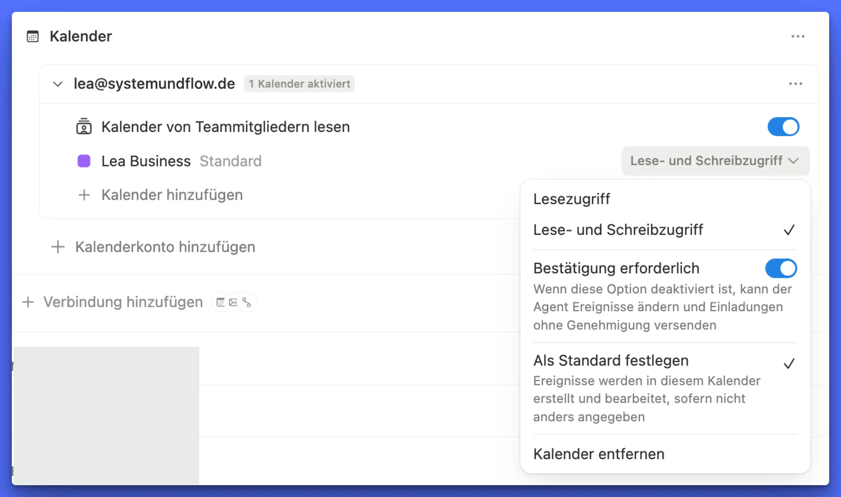 Bei bestimmten Integrationen – aktuell vor allem bei der Mail und Kalender-Verbindung – gibt es eine zusätzliche Sicherheitsebene: die Option “Bestätigung erforderlich”. Du findest sie in den Agent-Einstellungen unter Tools & Zugriff, direkt bei der jeweiligen Verbindung.