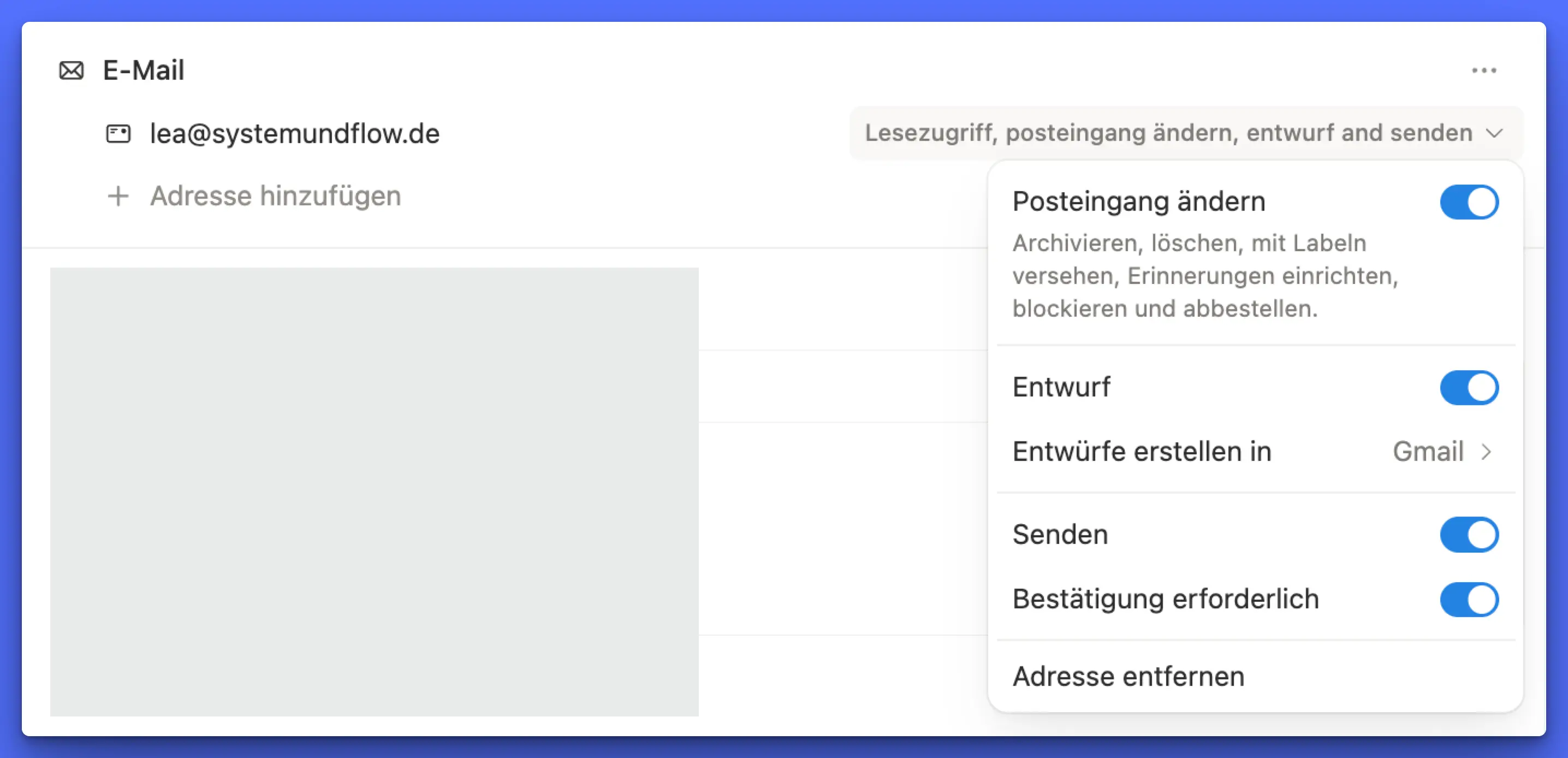 - Du bestimmst innerhalb der Integrationen, welche Aktionen erlaubt sind (z.B. E-Mails lesen ja, senden nein).