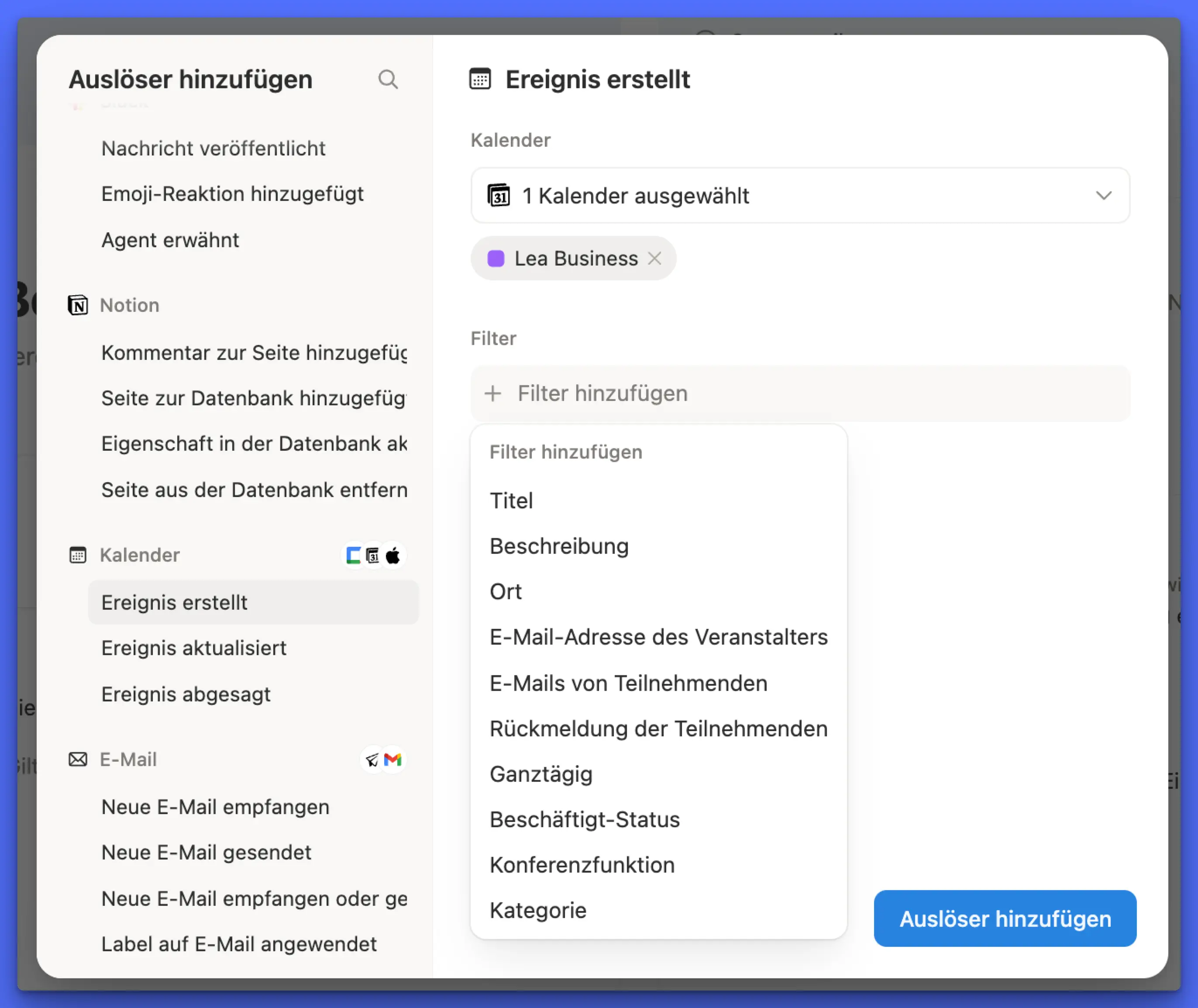 Auch für deinen Kalender kannst du Trigger einrichten (funktioniert mit Notion Kalender, Google Calendar oder dem Apple Calendar):