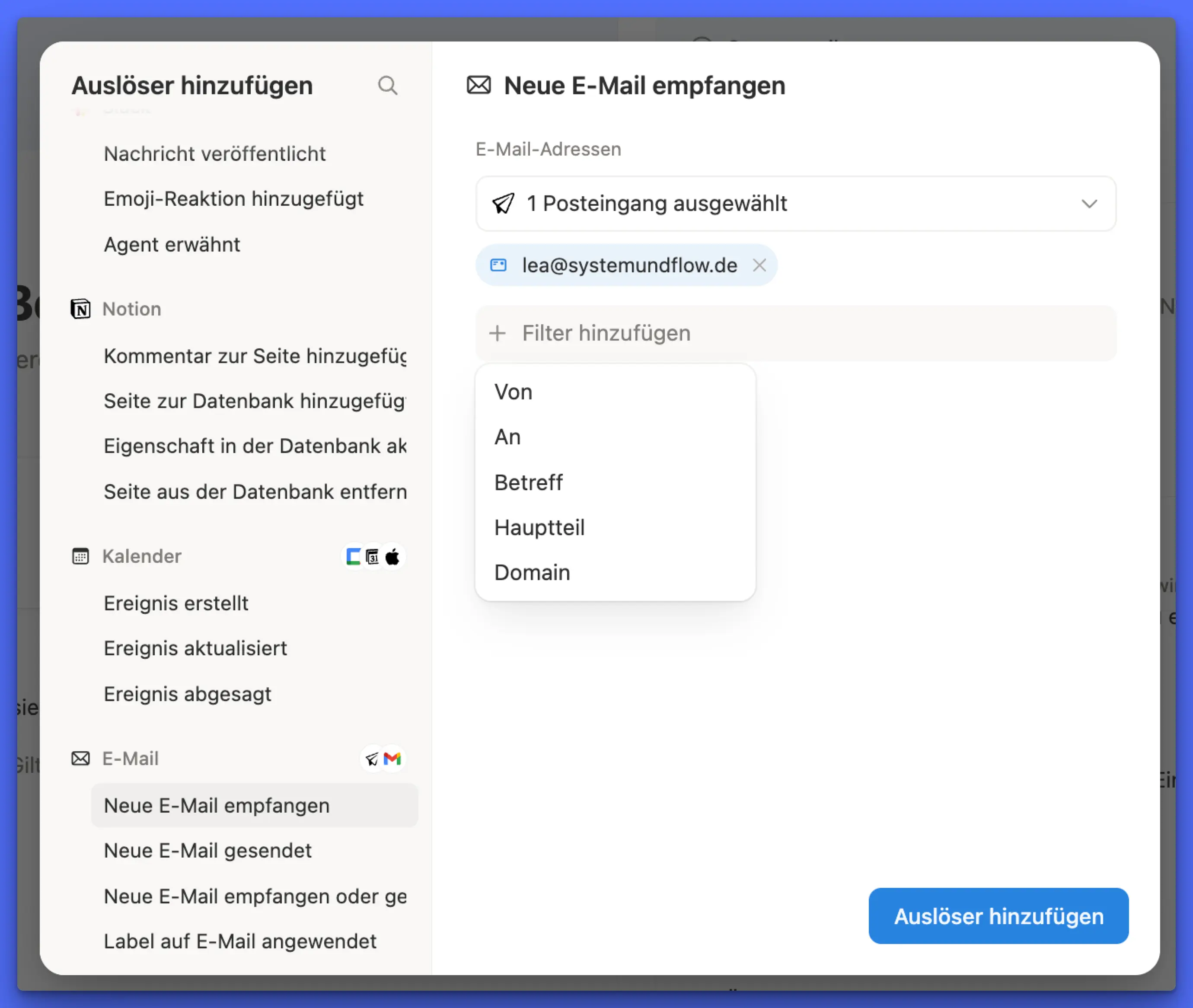 Du kannst pro Agent auch mehrere Trigger gleichzeitig einrichten. Außerdem lassen sich Trigger mit Filtern eingrenzen. Bei Mail-Triggern kannst du zum Beispiel nach Absender:in, Empfänger:in, Betreffzeile, Inhalt oder Domain filtern; bei Notion-Datenbanken spezielle Eigenschaften auswählen.