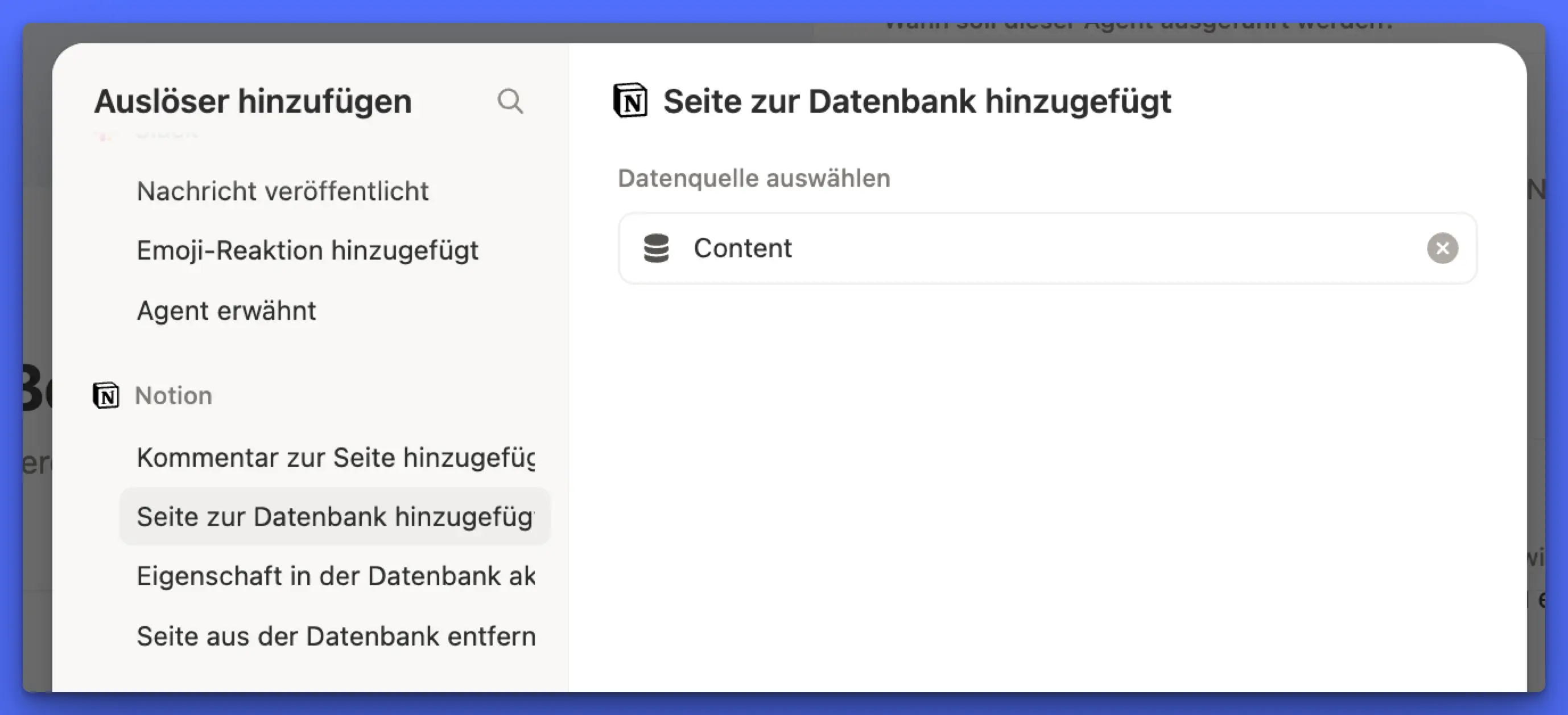 - Seite erstellt: Der Agent wird aktiv, sobald eine neue Seite in einer bestimmten Datenbank angelegt wird.