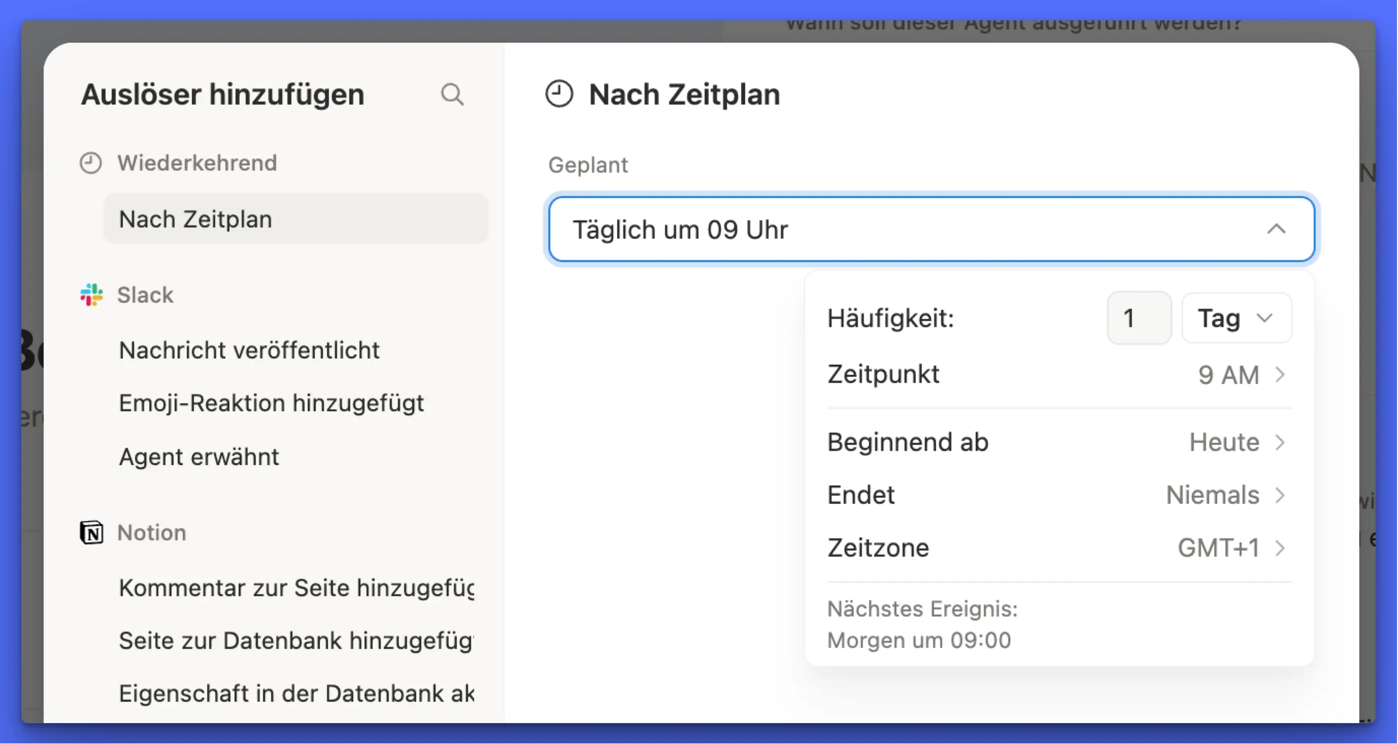 Das kann ein Zeitplan sein (z.B. jeden Montag um 8 Uhr), ein Event in Notion (z.B. wenn eine neue Seite in einer bestimmten Datenbank erstellt wird) oder sogar ein externes Ereignis wie eine eingehende E-Mail.