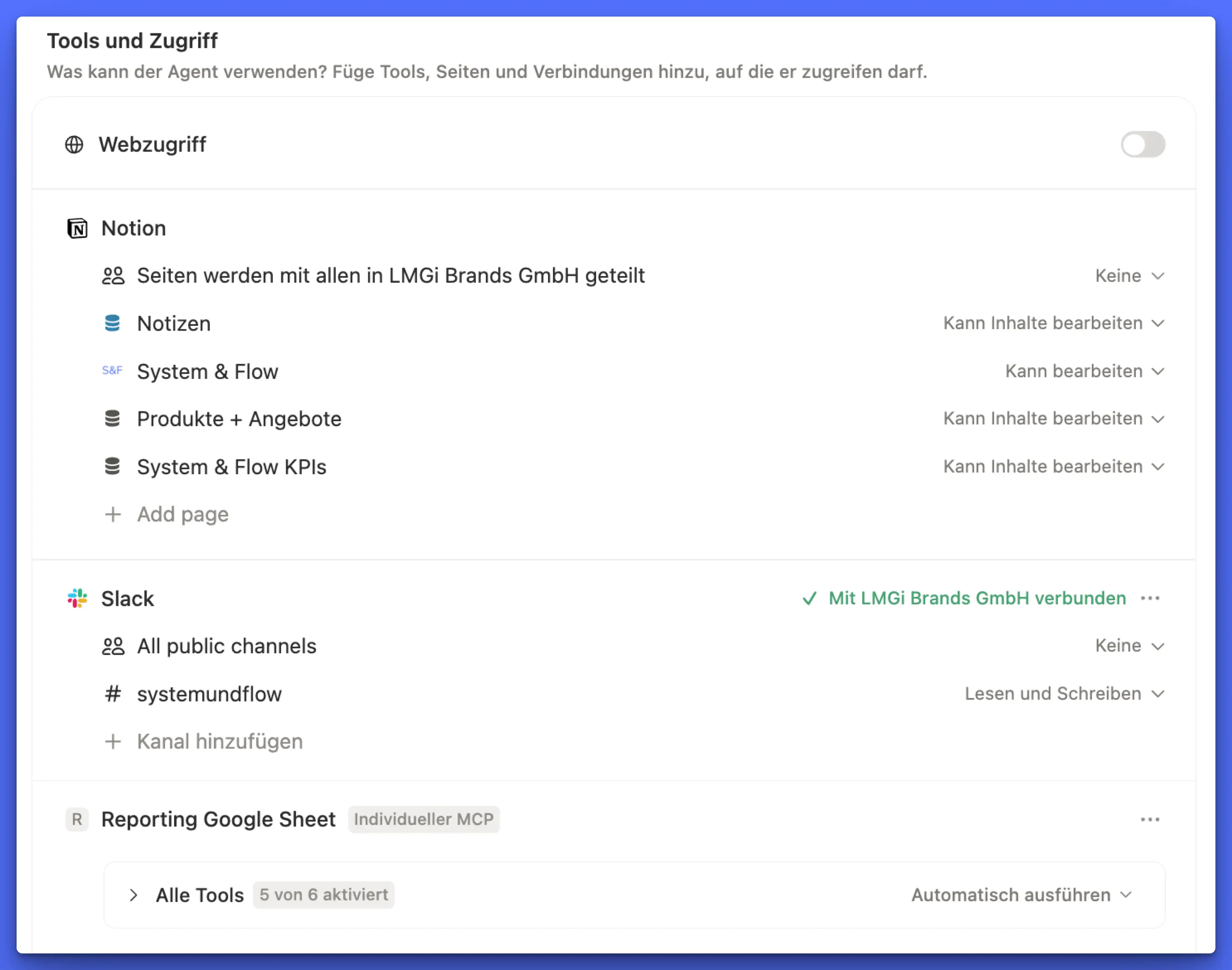 Das können einzelne Datenbanken sein, bestimmte Seiten oder auch externe Verbindungen wie Gmail, Slack oder MCP-Server (dazu gleich mehr). Du entscheidest also ganz gezielt, welche Informationen der Agent sehen und bearbeiten darf und welche nicht.