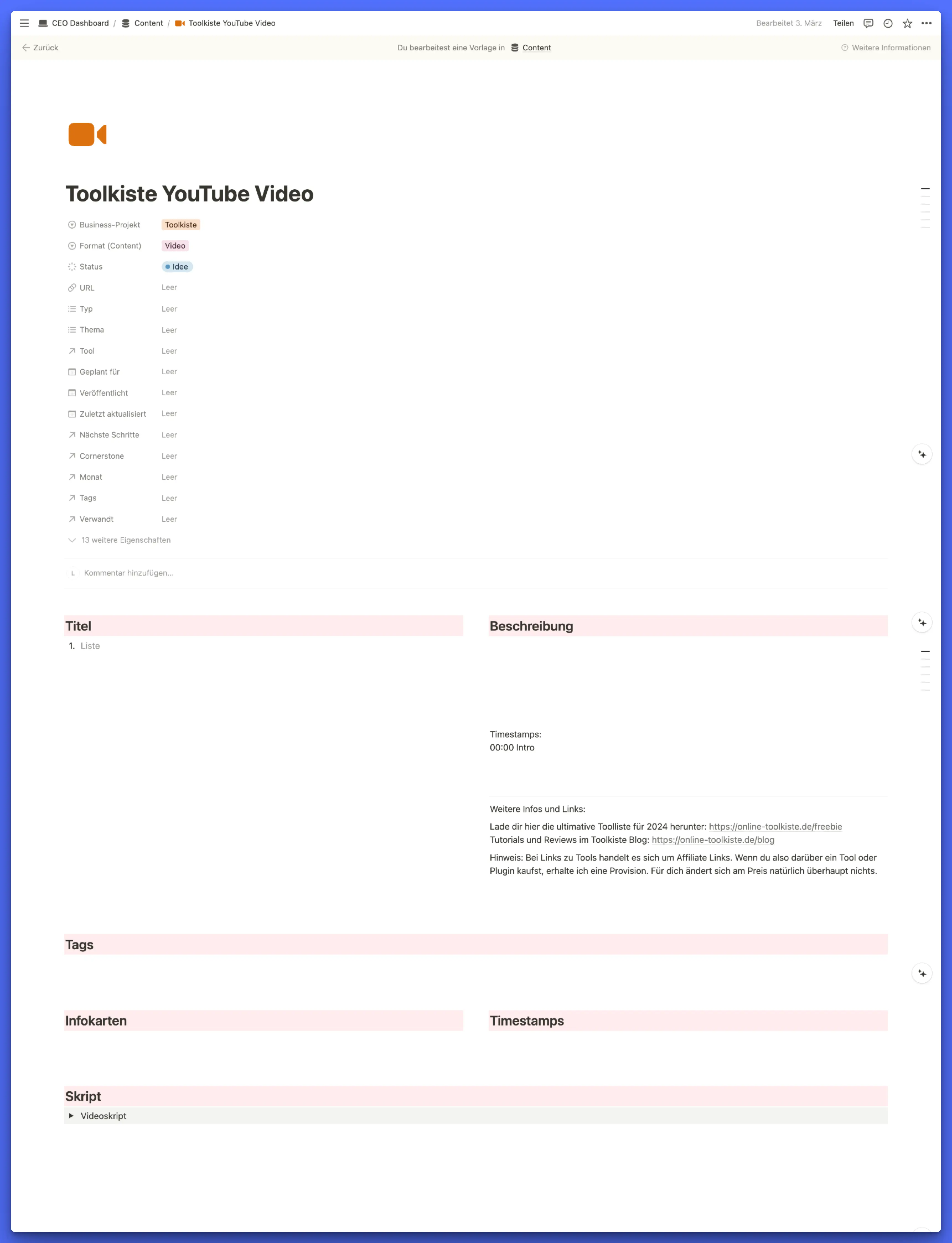 Für die Videos, die ich für den YouTube-Kanal der Toolkiste mache, sieht das Template beispielsweise so aus – einige Eigenschaften sind schon ausgefüllt und unten kann ich direkt mit dem tatsächlichen Videoinhalt loslegen: