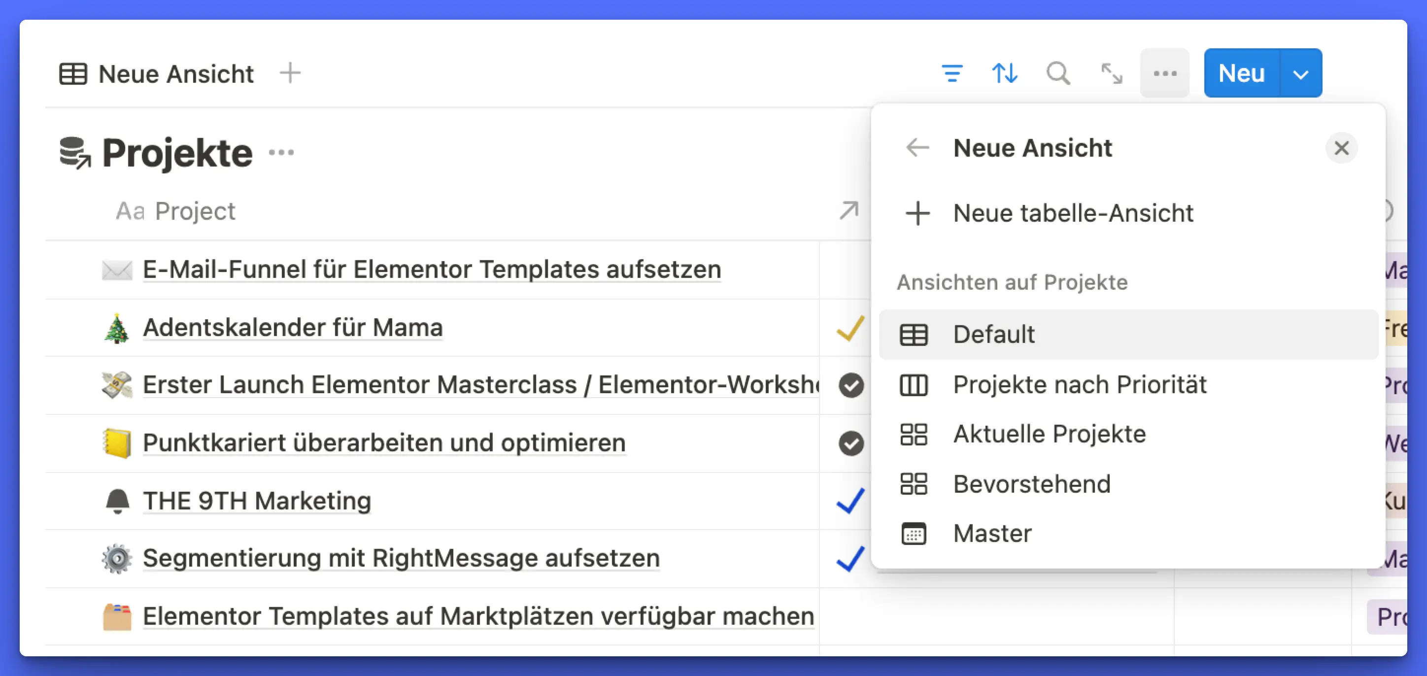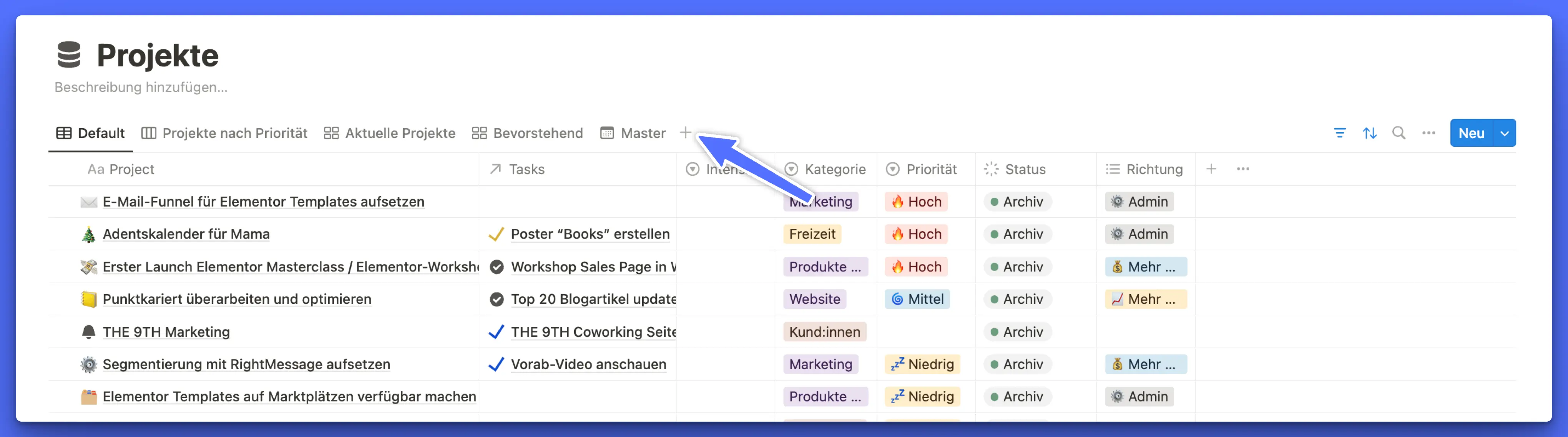 Ein Tipp: Wenn du eine neue Datenbank angelegt, die Eigenschaften konfiguriert und erste Einträge hinzugefügt hast, erstell erstmal in der Datenbank selbst einige Ansichten. Dazu klickst du einfach hier: