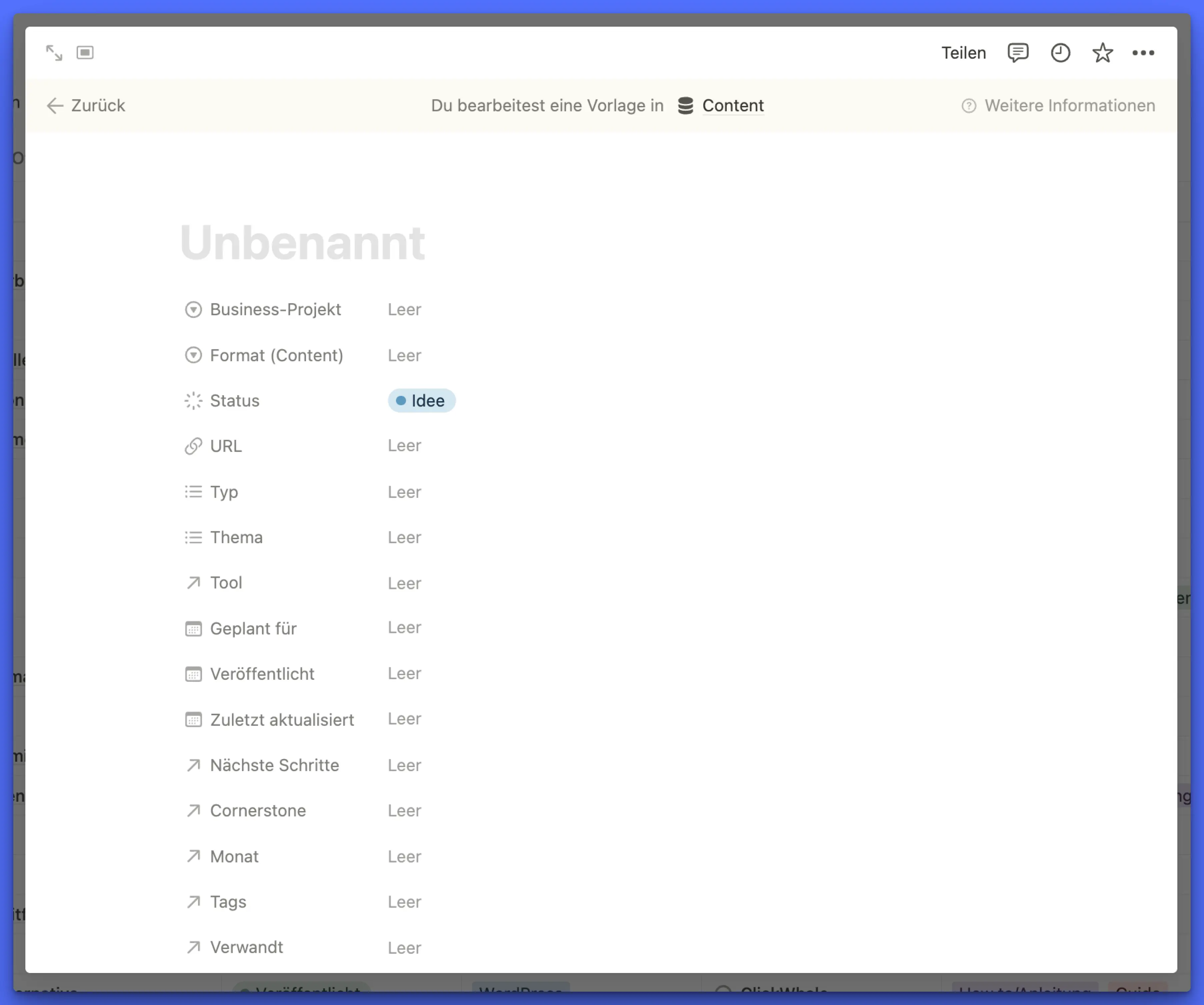 Es öffnet sich eine Seite, die erstmal aussieht wie ein neuer Eintrag in dieser Datenbank – mit dem Unterschied, dass oben ein beiger Balken zu sehen ist. Der zeigt dir, dass du ein Template bearbeitest.