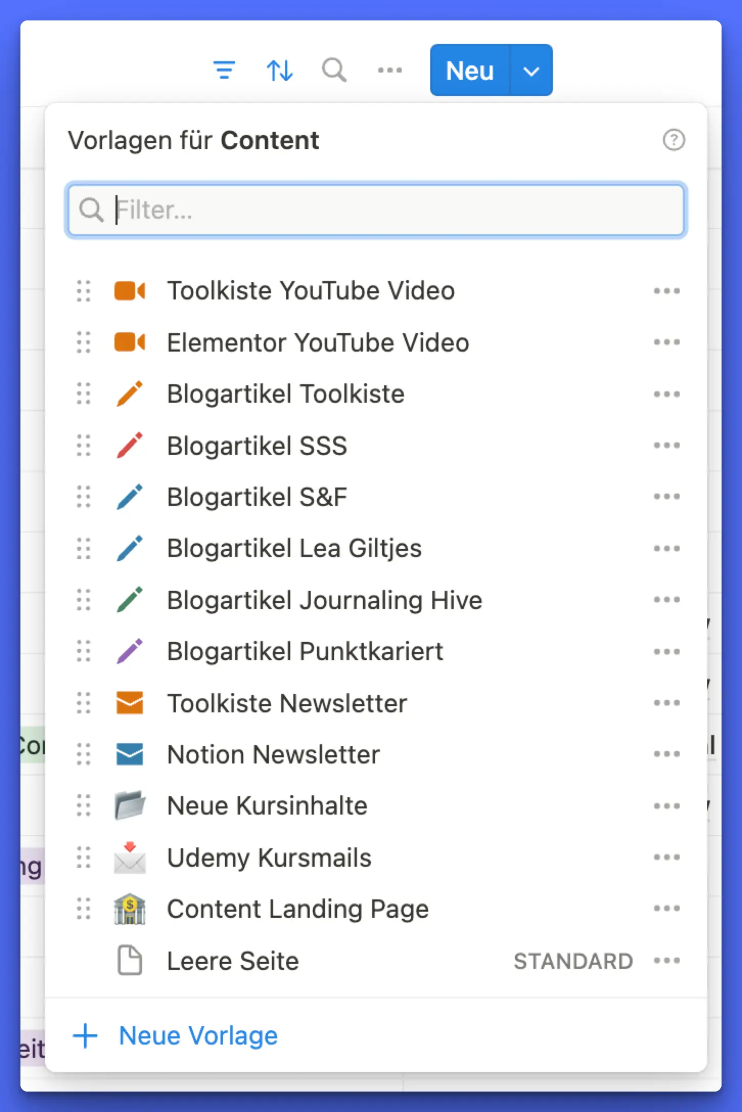 Um ein neues Template anzulegen, klickst du in der Datenbank auf den blauen Pfeil neben “Neu” und dann auf “Neue Vorlage”.