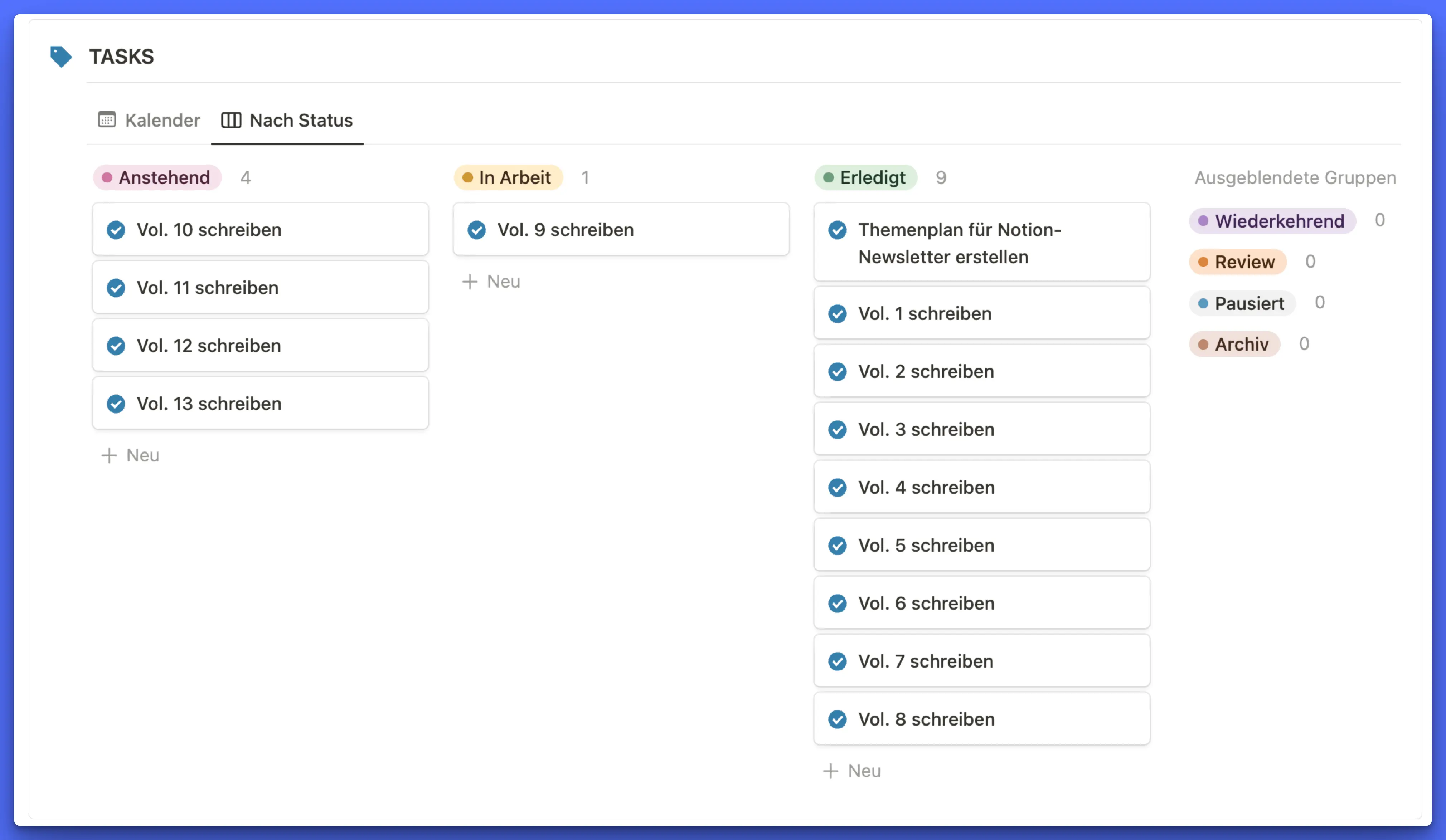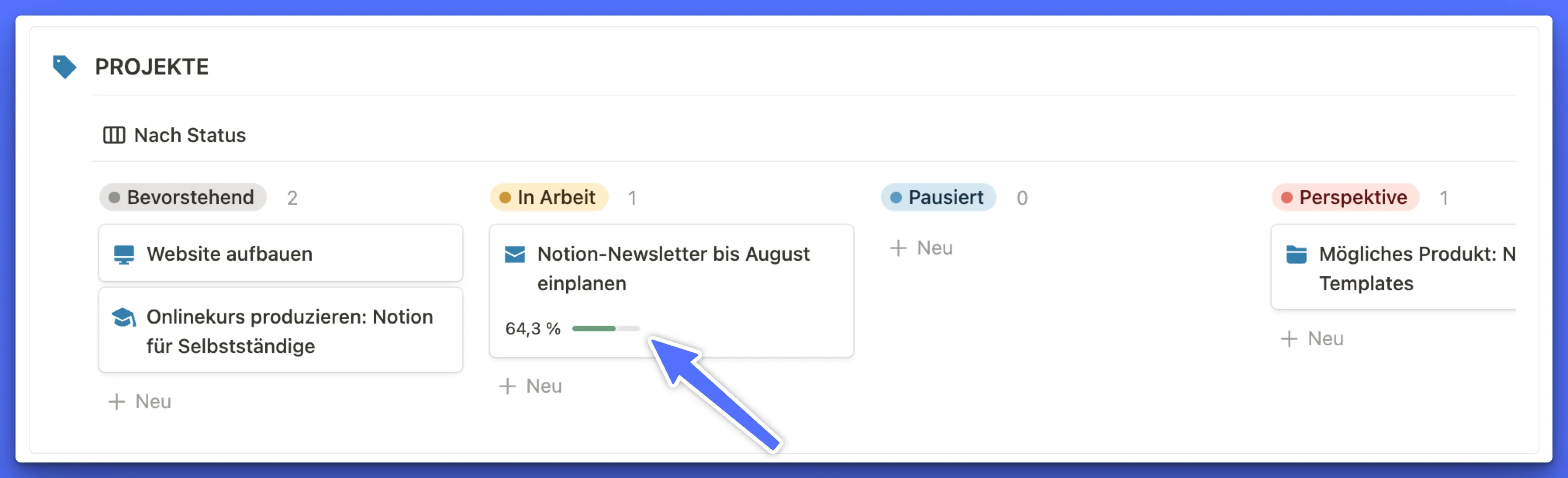 Diese Ansicht ist besonders praktisch für Einträge, die einem klaren Prozess folgen oder regelmäßige Status-Updates haben (Projekte oder Aufgaben beispielsweise). Für die Aufteilung der einzelnen Spalten kannst du jede Eigenschaft auswählen, hier z.B. der Status: