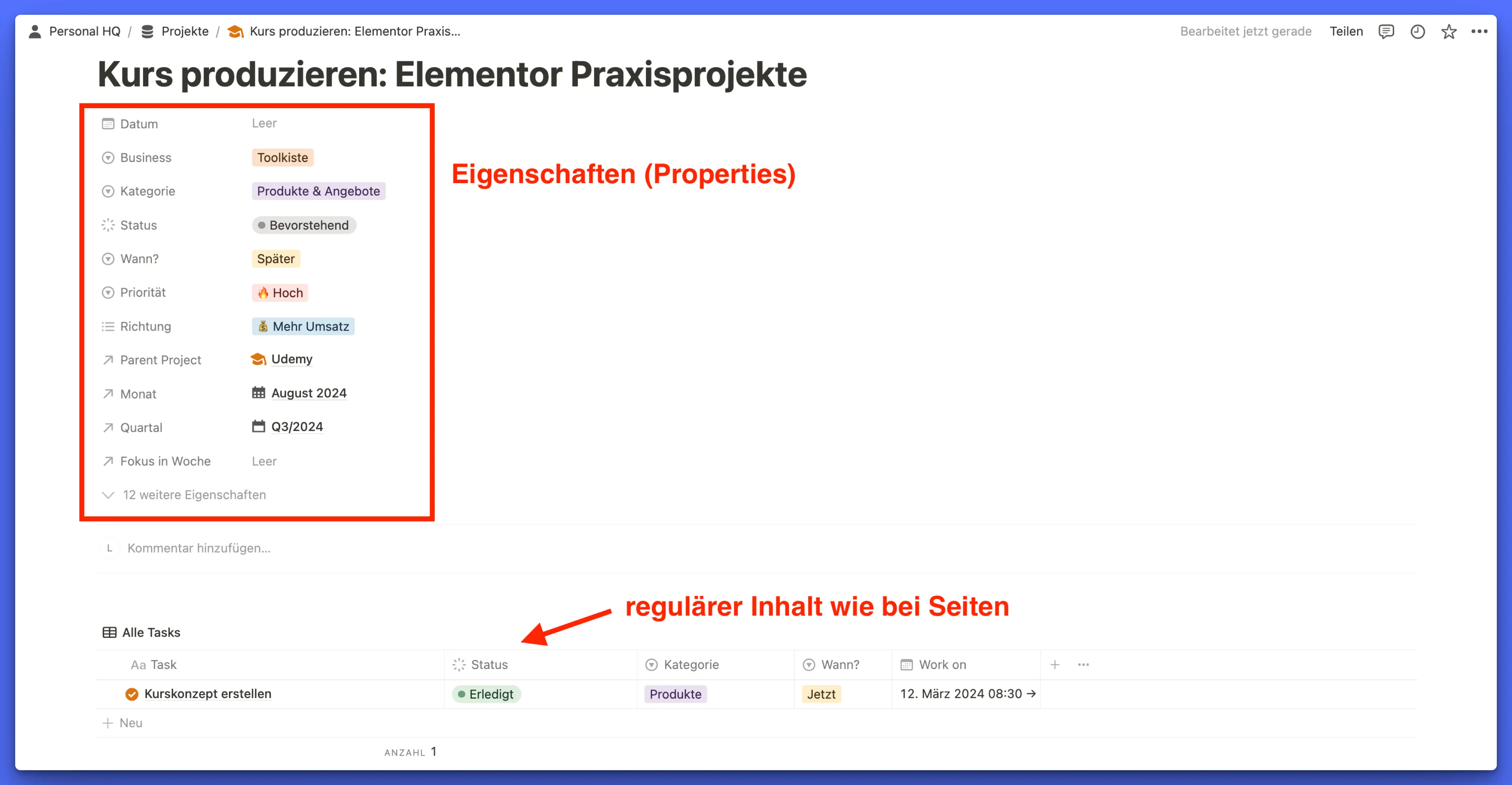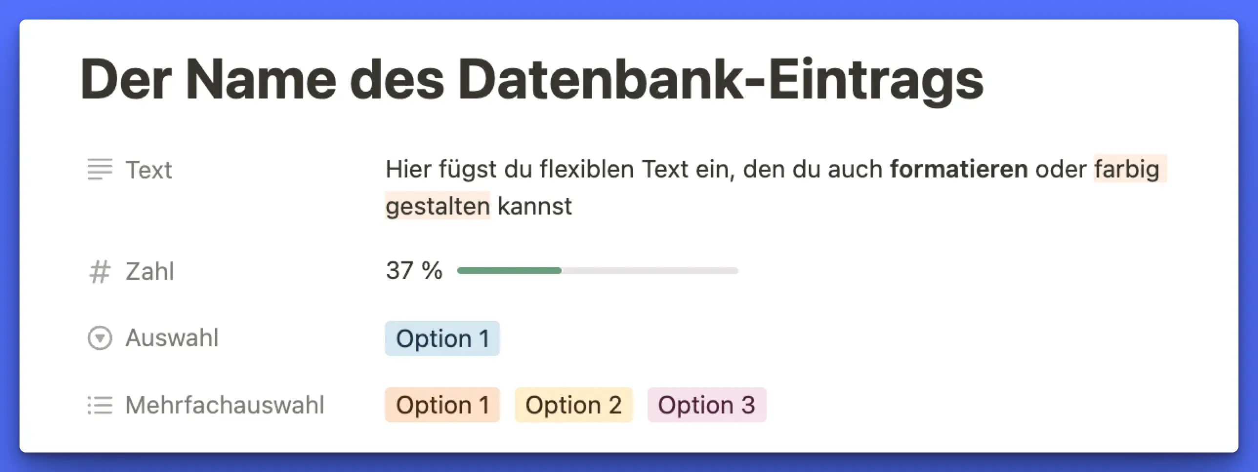Und dann gibt es die Datenbanken. Ein Eintrag in einer Datenbank ist im Prinzip auch eine Art Seite, du kannst dort nach dem gleichen Konzept beliebig Inhalte einfügen – mit einem entscheidenden Unterschied: