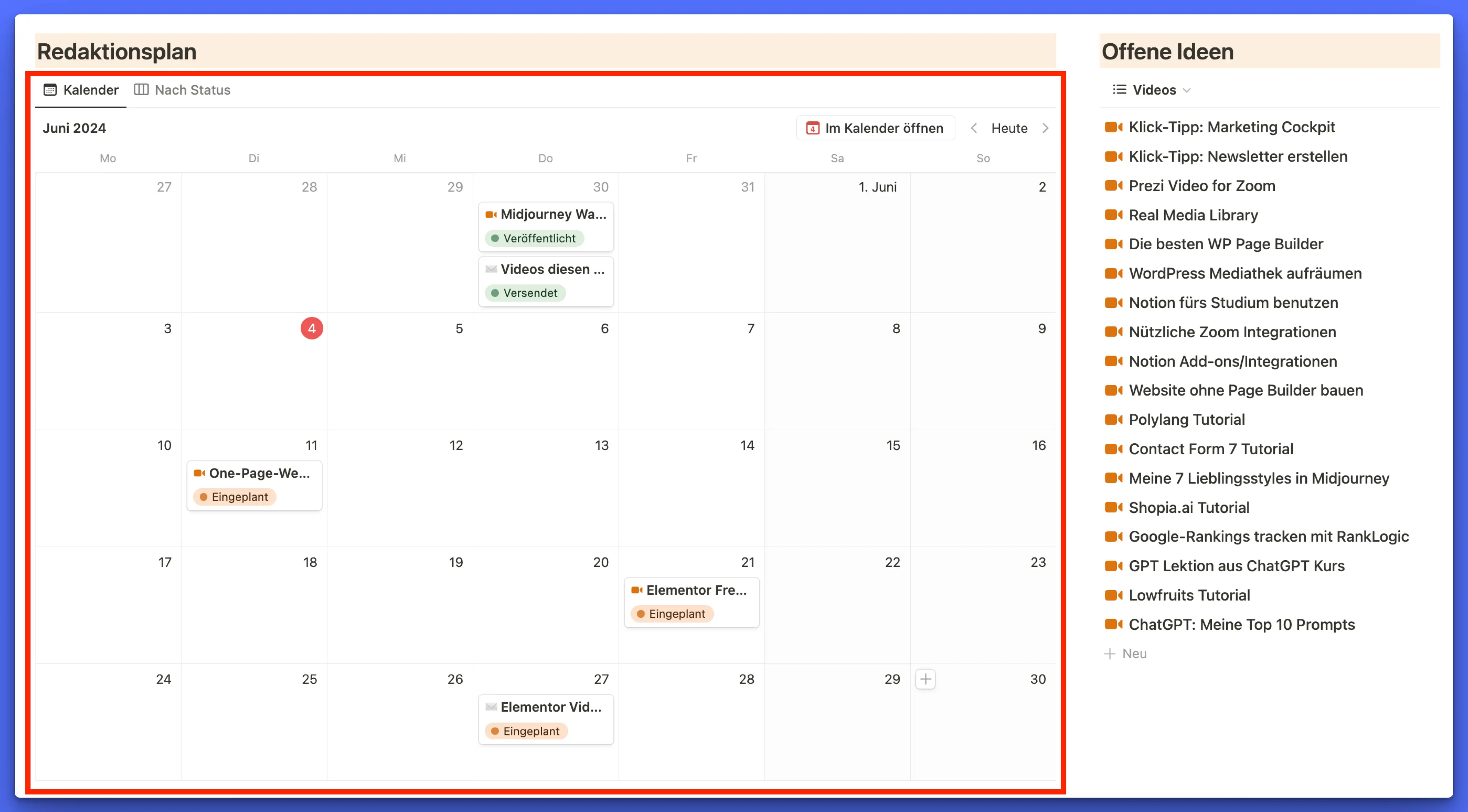 Und ja, das hier ist die Kalender-Ansicht meiner Content-Datenbank – hier seh ich, für wann welche Inhalte geplant sind und wie der aktuelle Status ist: