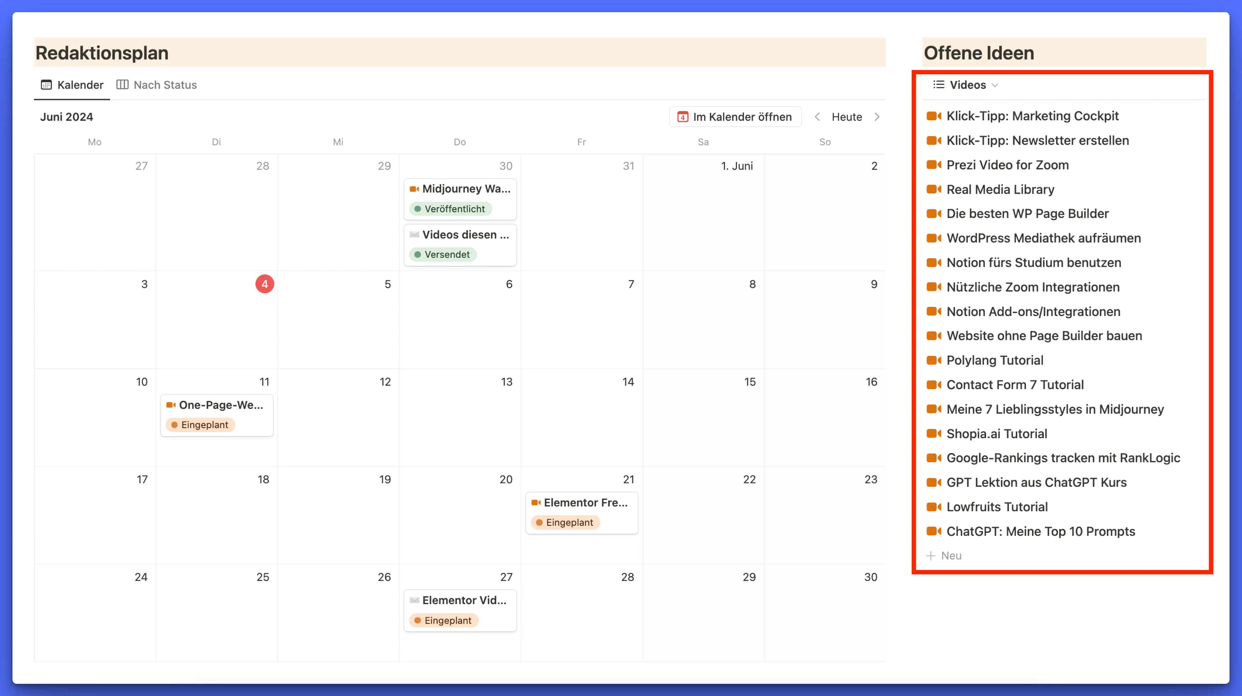 Ich nutze die Ansicht bspw. auf meinem Content-Dashboard für die Toolkiste – rechts werden in der Liste alle Ideen für neue Videos angezeigt, die noch nicht terminiert sind: