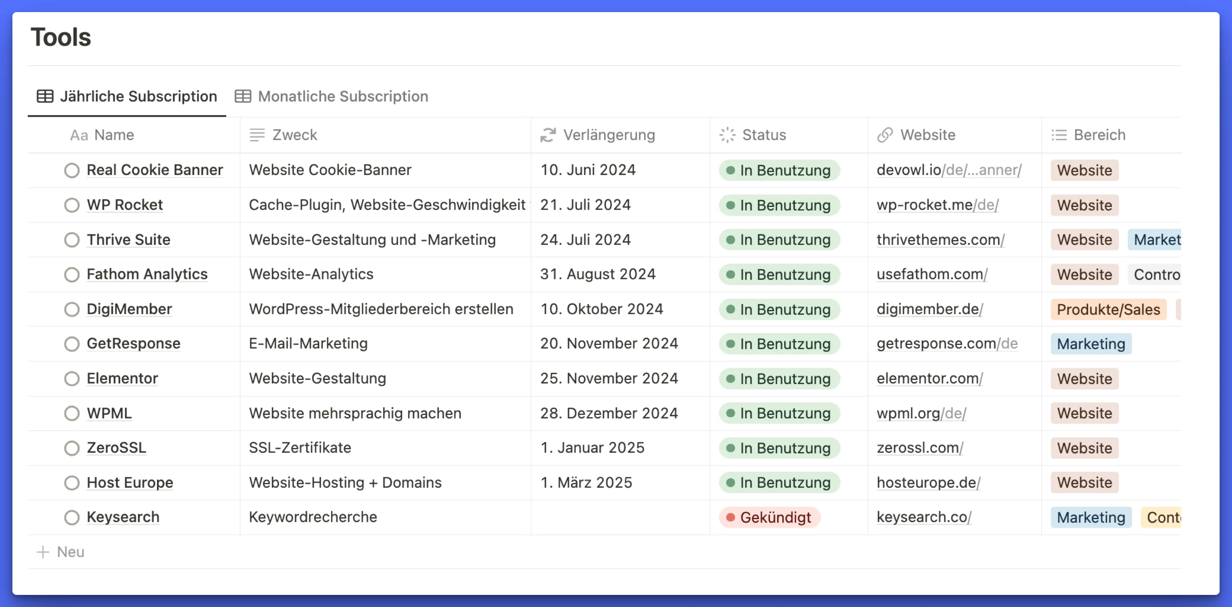Auf meinem CEO Dashboard hab ich bspw. meine aktiven Abos für Tools in Tabellenform eingebaut: