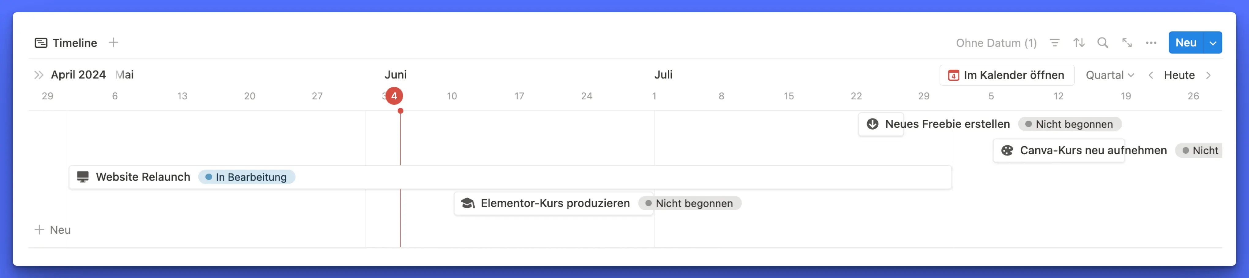 Die Timeline-Ansicht ist nämlich genau darauf ausgelegt, Einträge mit einer größeren Datumsspanne anzuzeigen – die kann auch gerne über mehrere Monate gehen! Sehr praktisch z.B. für die Projektplanung, um Überschneidungen zu sehen und gut planen zu können.