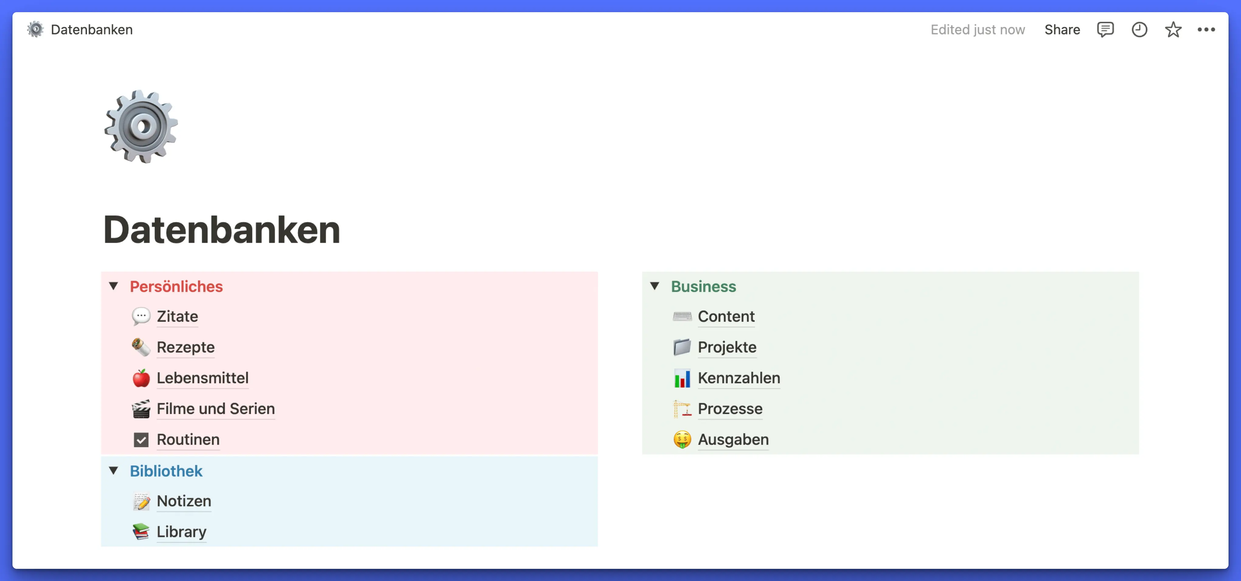 Am übersichtlichsten ist es, wenn du eine extra Seite “Datenbanken” in deinem Workspace anlegst. Alle Datenbanken werden dort abgelegt; abrufen kannst du sie dann wie gesagt von überall aus. Das könnte so aussehen: