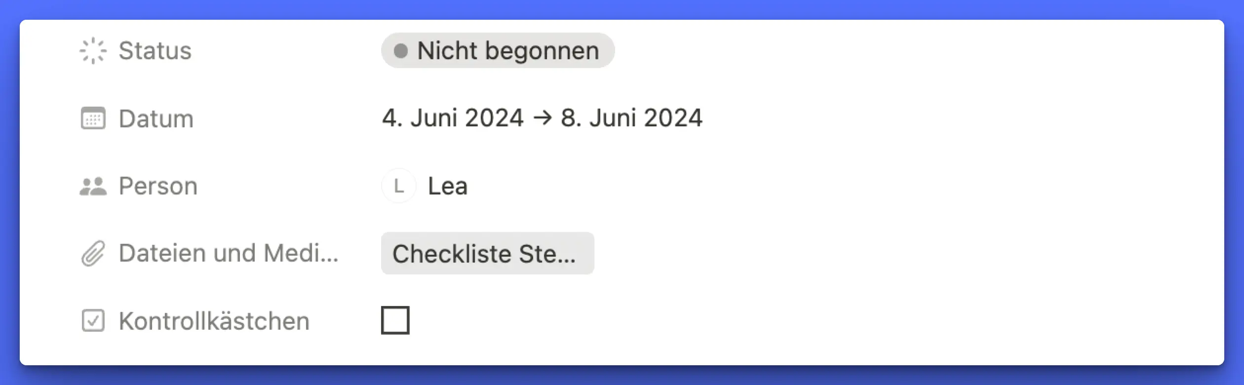 - Person: wenn du Notion im Team nutzt, kannst du den Eintrag einer Person zuweisen (super für Aufgaben-Management)
