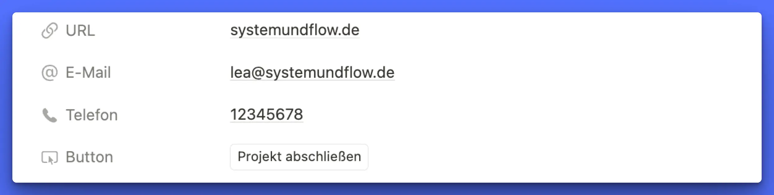 - Button: mit einem Button kannst du Aktionen automatisieren und es unter anderem so einstellen, dass mehrere Eigenschaften angepasst werden, sobald du den Button klickst (z.B. Status auf “Abgeschlossen”, Datum auf heute usw.) – mehr dazu hier: Buttons effektiv einsetzen