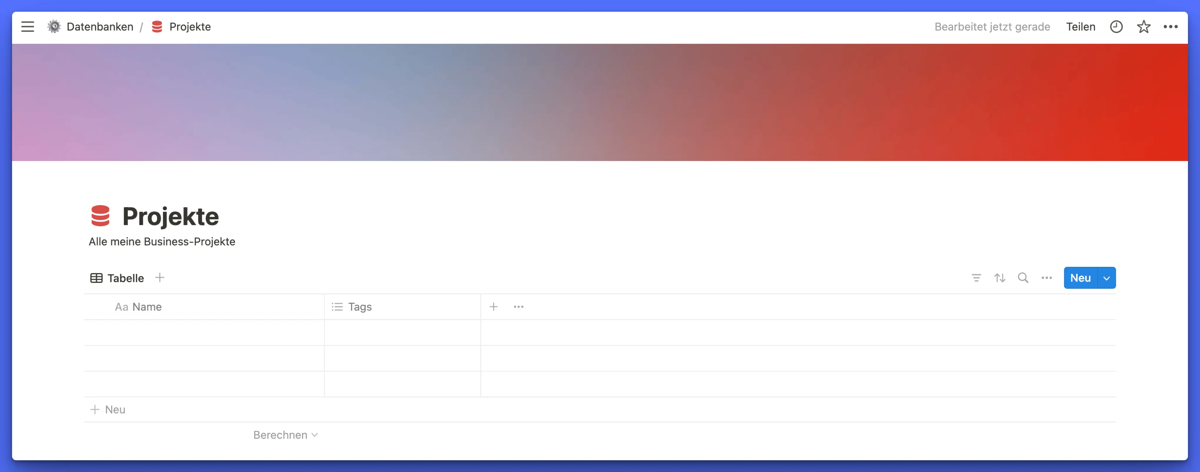Die neue Datenbank wird dann auf einer extra Seite geöffnet. Hier siehst du jetzt wirklich nur die Datenbank, kannst also keine zusätzlichen Blöcke und Inhalte hinzufügen, sondern nur neue Einträge für diese Datenbank.