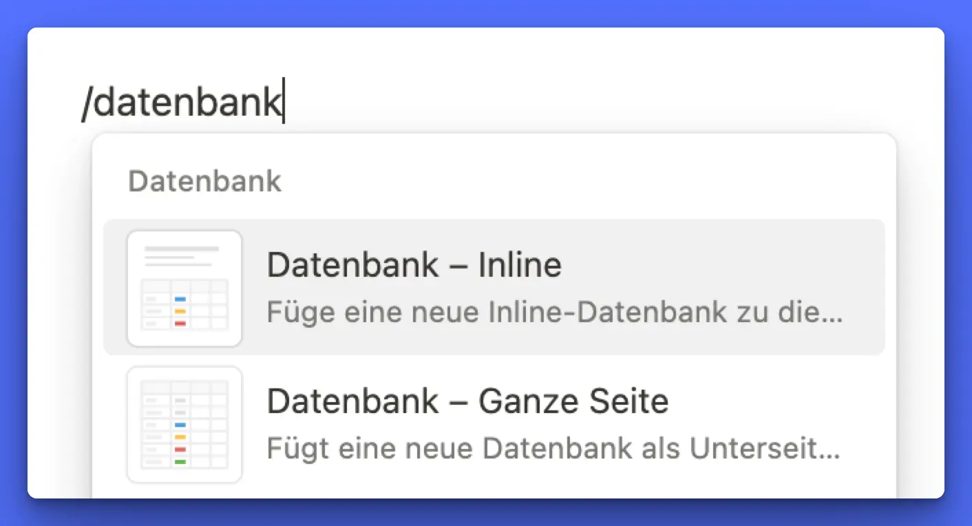 Wenn du eine neue Datenbank erstellen willst, hast du zwei Möglichkeiten: Inline oder Ganze Seite.