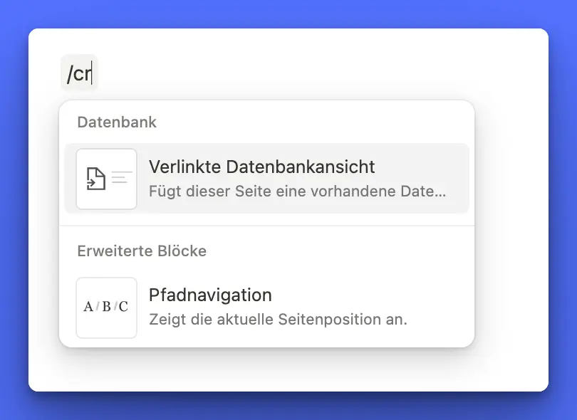 Wenn du eine Datenbank in eine Seite einfügen möchtest – egal in welcher Ansicht – gibst du an der gewünschten Stelle den Befehl /cr ein und wählst den Block Verlinkte Datenbankansicht aus.