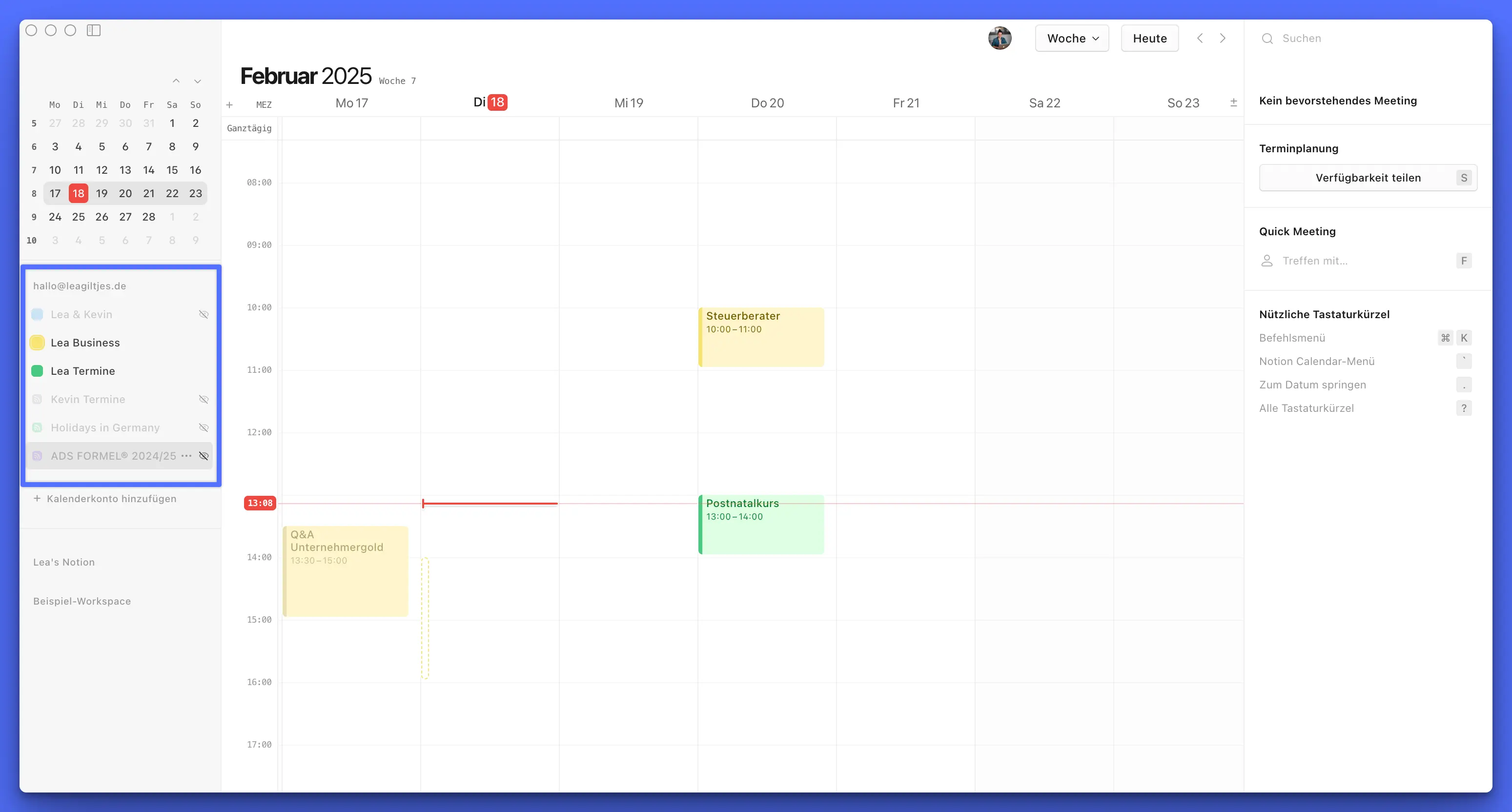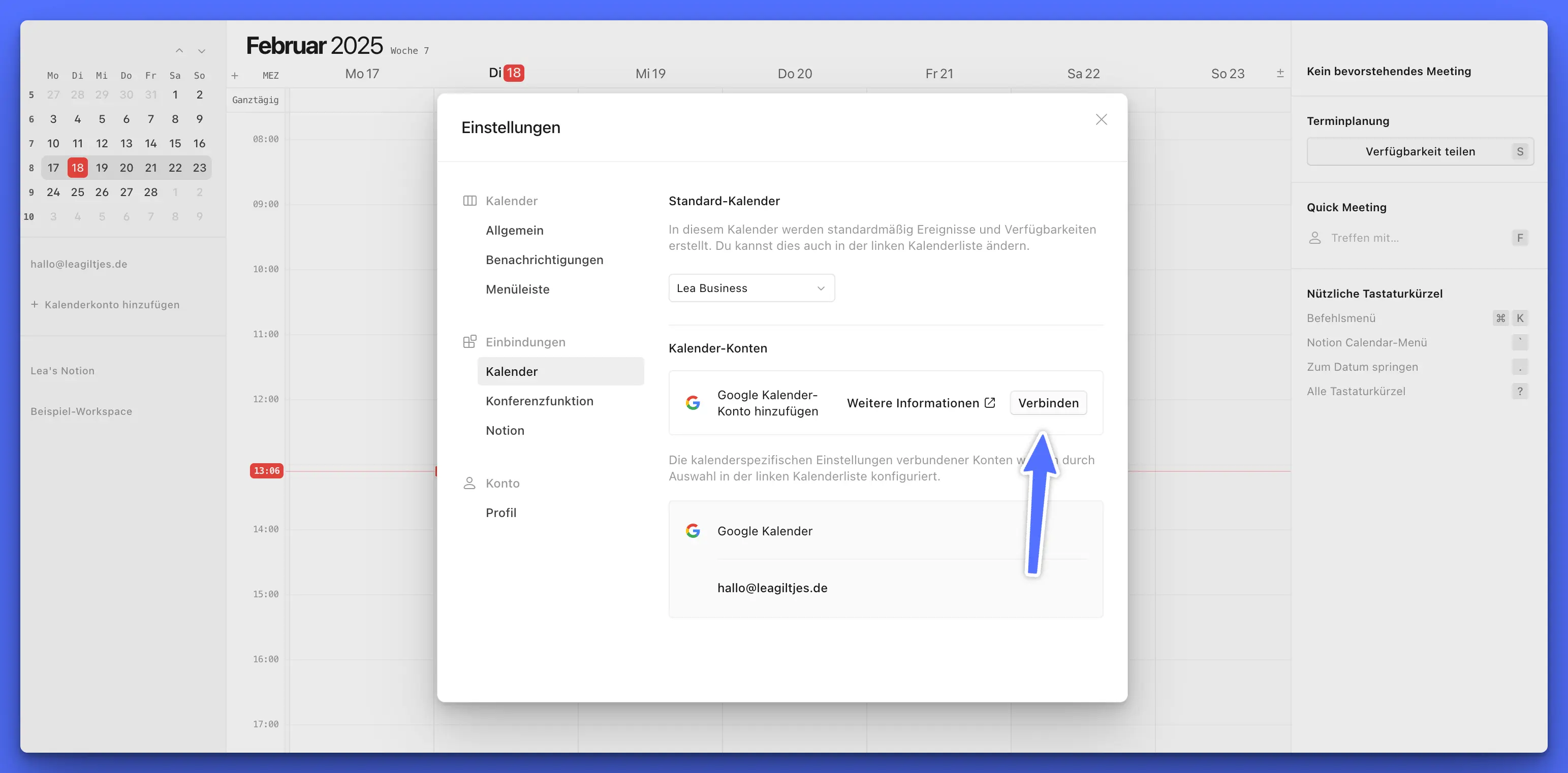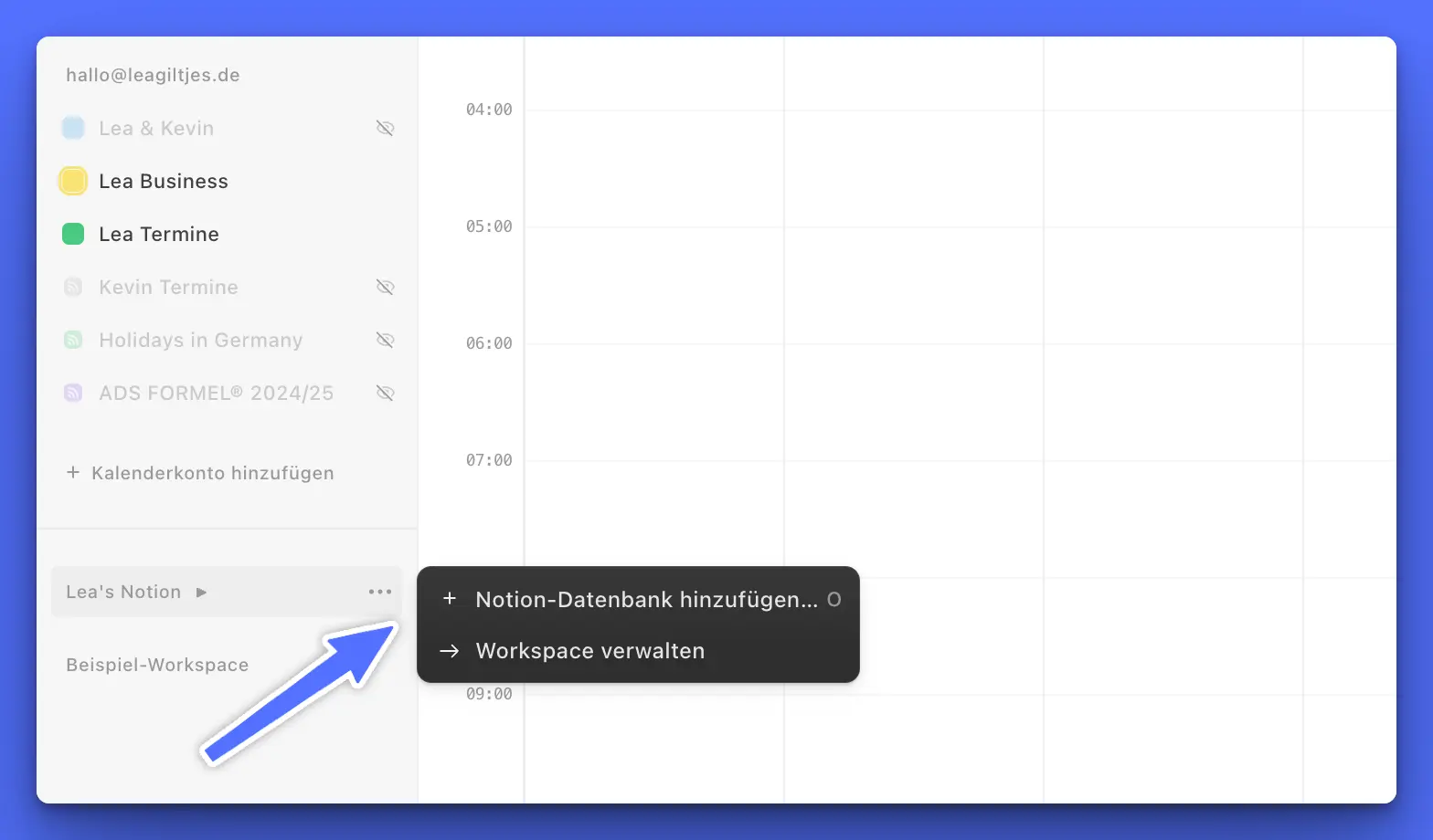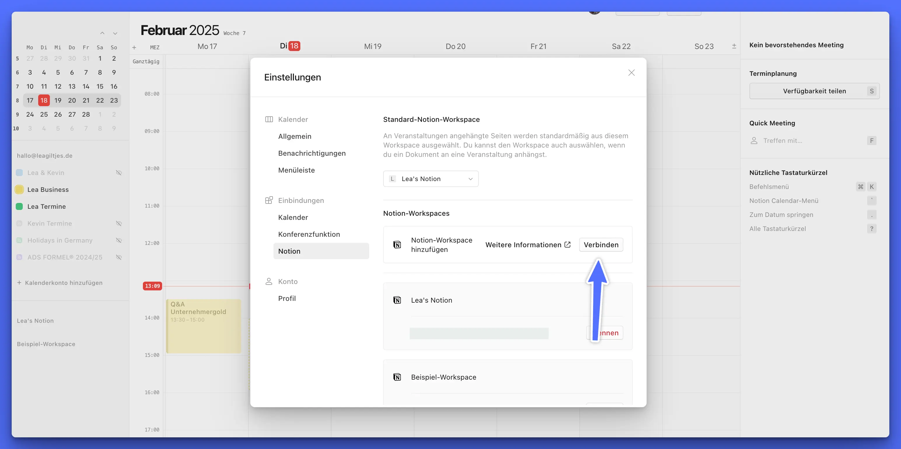Spannend wird’s, wenn du deinen normalen Notion-Account auch verknüpfst und deine Datenbanken in den Kalender integrierst!