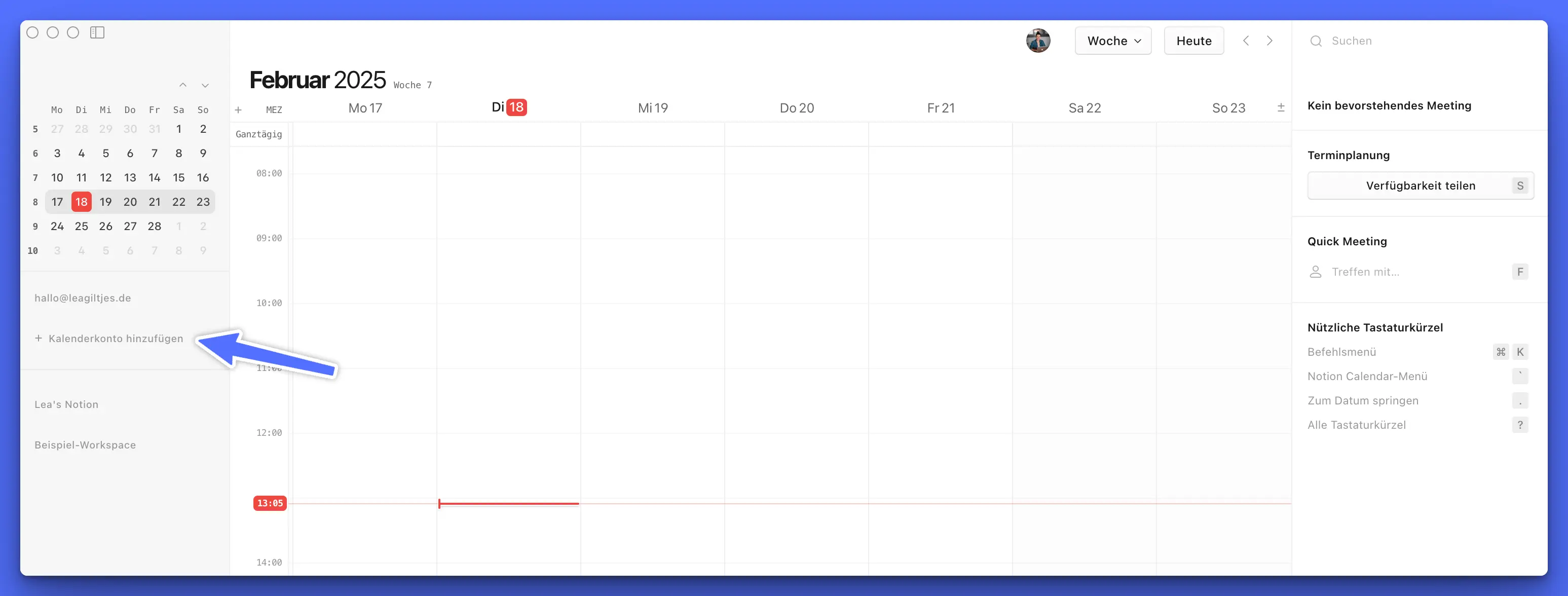 Schauen wir uns das anhand des Google Kalenders an. Um deine Kalender zu integrieren, klick links in der Sidebar auf Kalenderkonto hinzufügen :