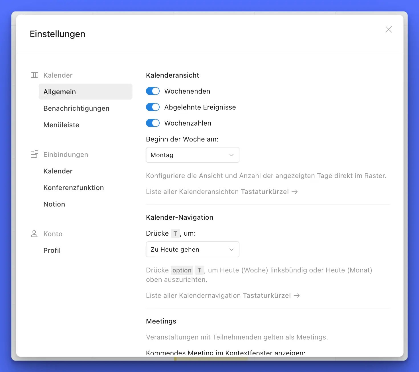 - ob Wochenenden im Kalender angezeigt werden sollen oder nicht