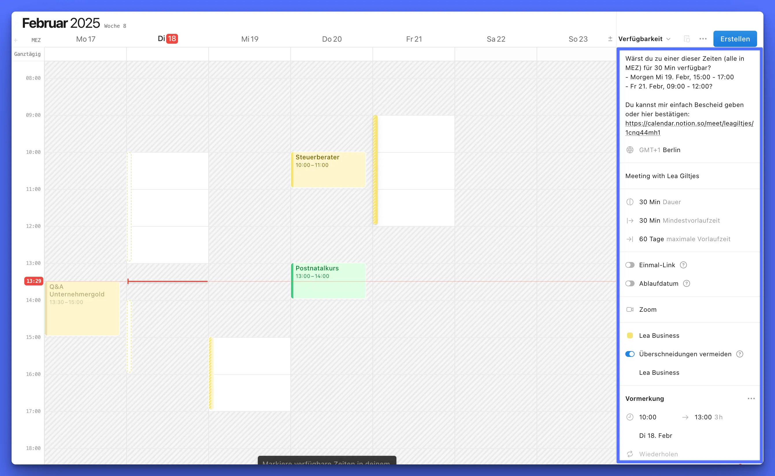 Triff alle Einstellungen so, wie sie für das jeweilige Event passen, und klick dann oben rechts auf Erstellen. Jetzt kannst du den Link wie bei Calendly & Co. auch verschicken und Termine können unkompliziert gebucht werden!