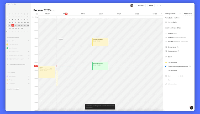Anders als bei Calendly kann man hier also keine generellen Verfügbarkeiten angeben (z.B. Erstgespräche können immer Dienstag zwischen 11 und 14 Uhr oder Mittwoch zwischen 15 und 18 Uhr stattfinden). Du musst wirklich die genauen Zeiten alle einzeln als Verfügbarkeit auswählen.