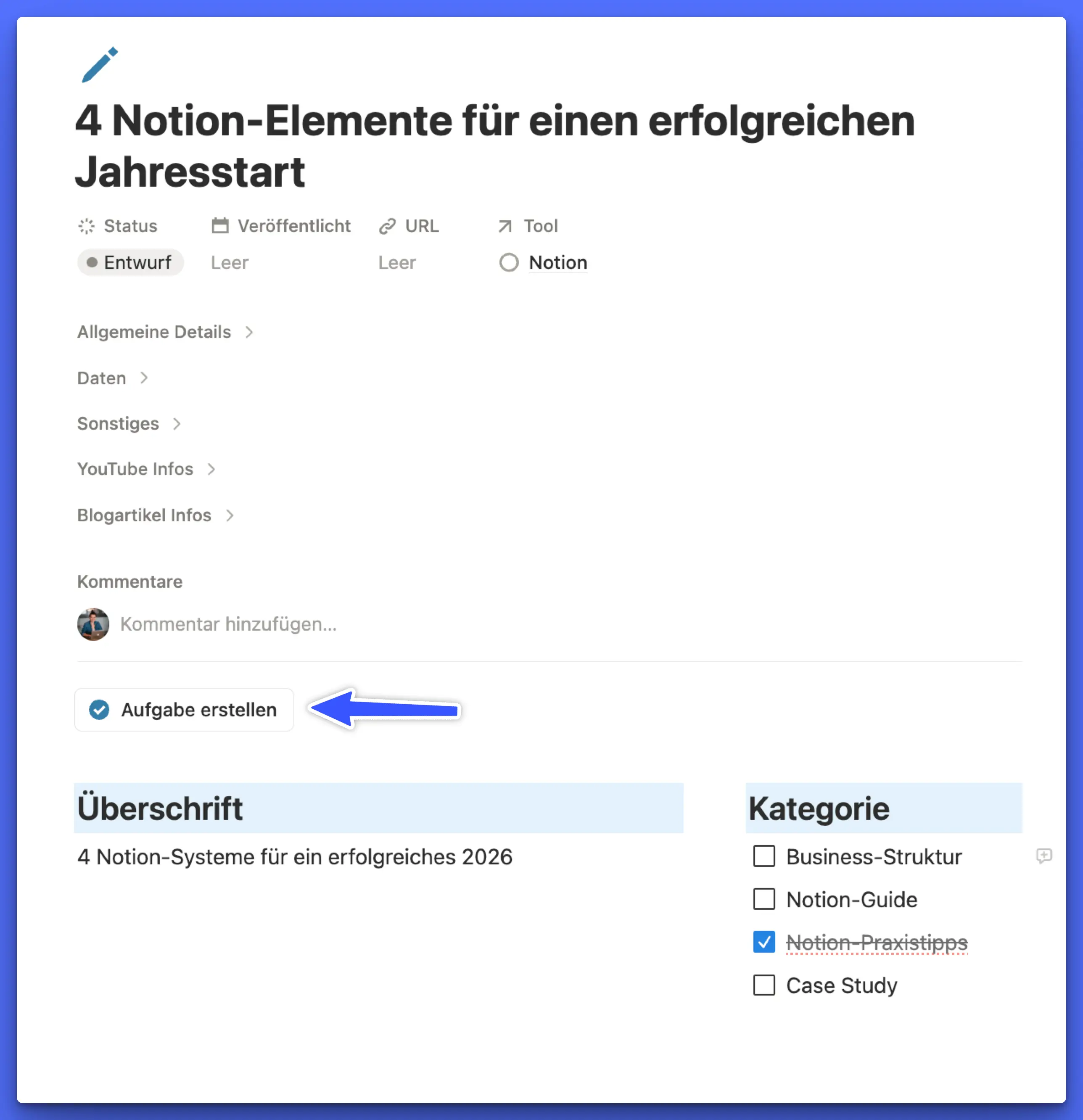 Mit Klick auf den Button wird ein Eintrag in der Aufgaben-Datenbank angelegt, bereits richtig benannt und mit dem jeweiligen Content verknüpft. Ich muss nur noch das Datum festlegen, wann ich an der Aufgabe arbeiten will!