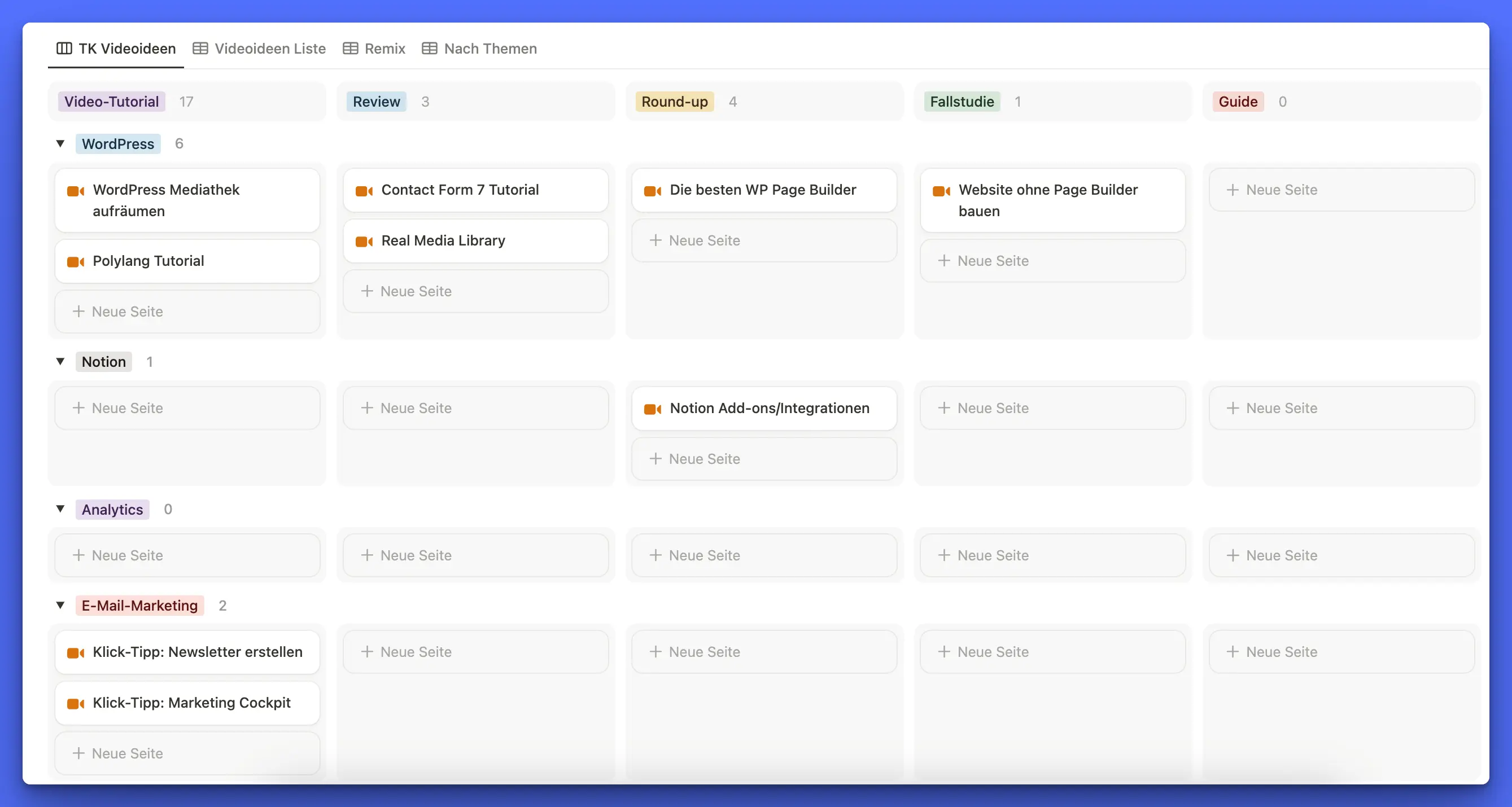 Ein Beispiel hierfür ist die Ideenmatrix: Eine Boardansicht der Datenbank, bei der als Gruppe das Content-Format ausgewählt ist (Video, Blogartikel, Instagram-Post usw. – das sind die Spalten) und als Untergruppe (das sind die Zeilen der Matrix) deine Kategorien.
