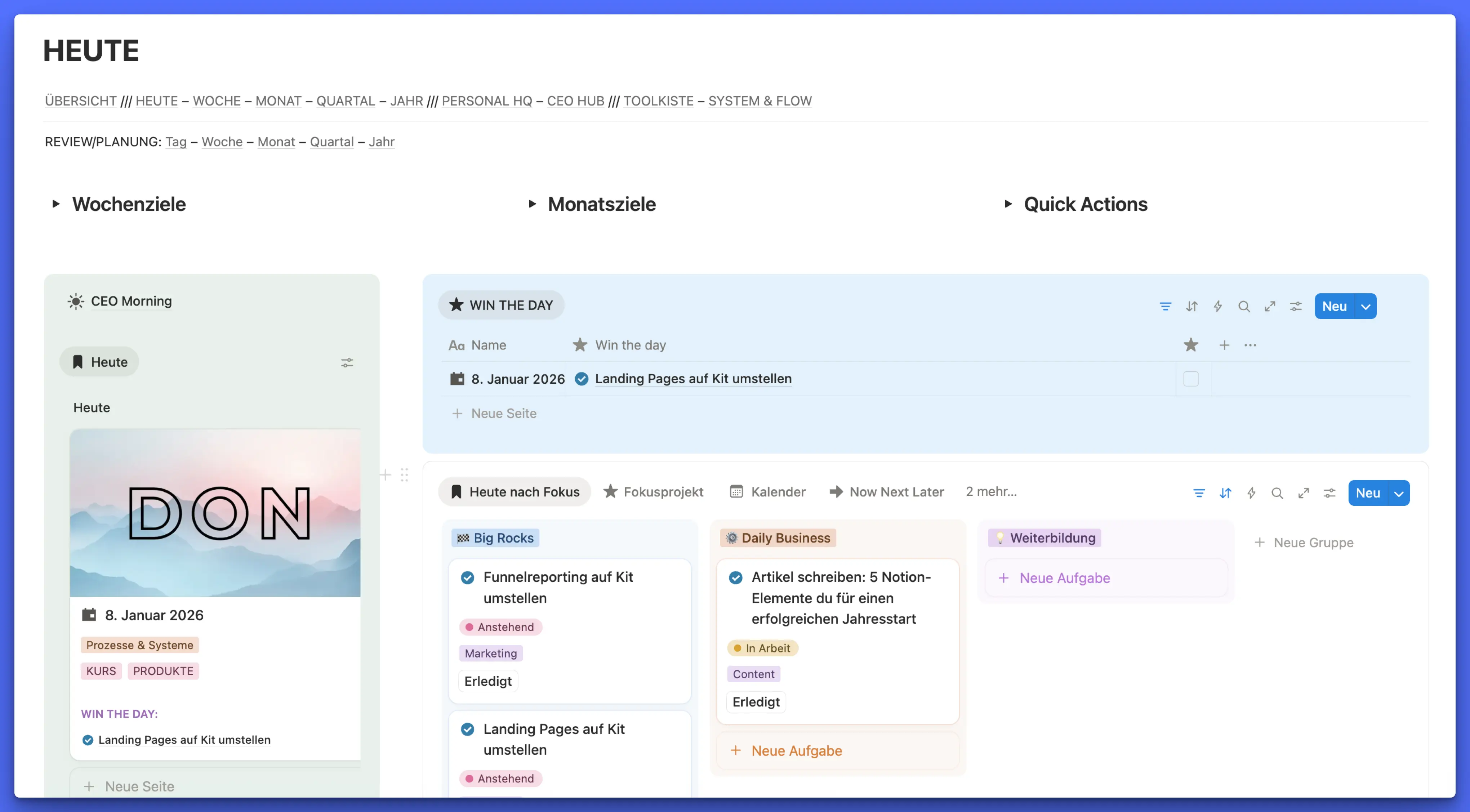 Ich arbeite mit verschiedenen Zeithorizonten. Für jeden dieser Horizonte hab ich ein separates Dashboard in Notion: