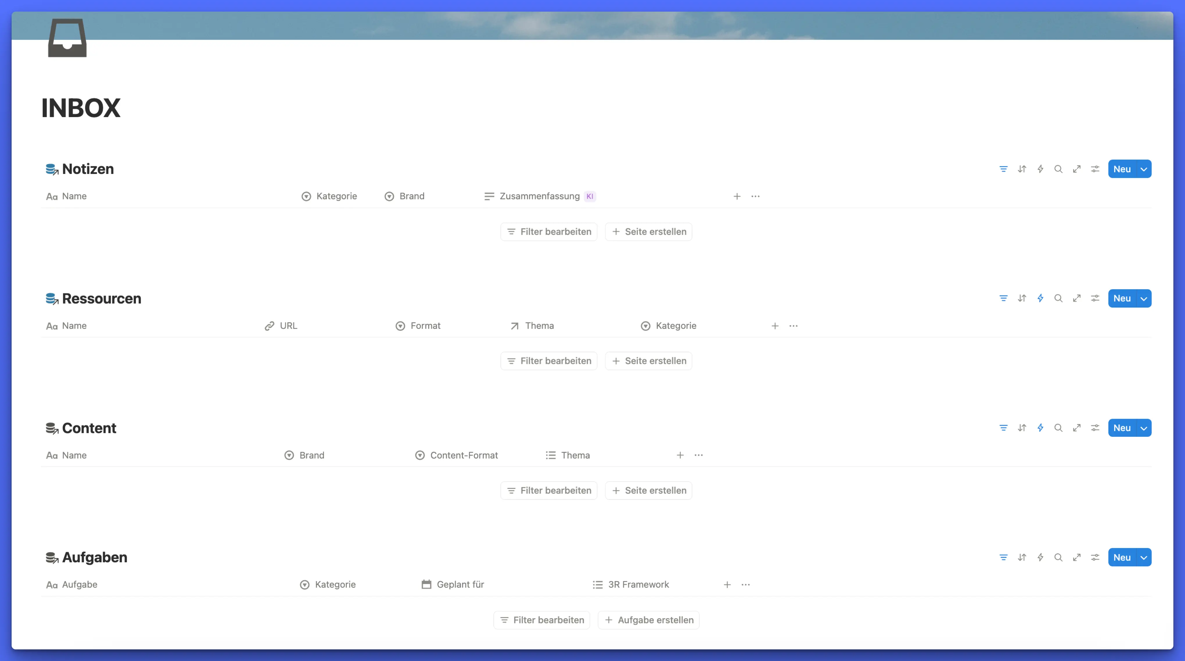Bau dir deswegen einen Ort, wo du solche Dinge, Gedanken, Ideen schnell festhalten kannst. Bei mir ist das die Inbox. Meine Inbox ist eine ziemlich simple Notion-Seite mit verlinkten Ansichten dieser Datenbanken: