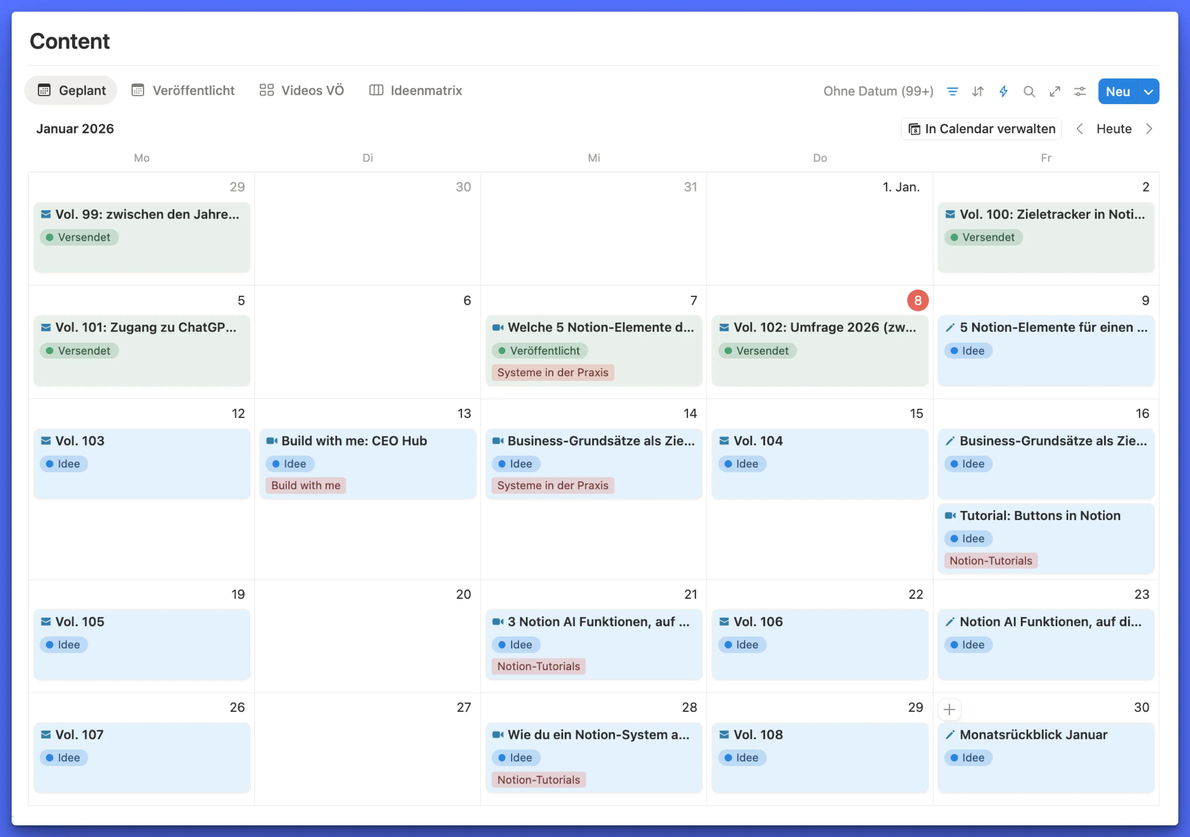 Zentraler Bestandteil meines Content-Dashboards ist der Redaktionsplan. Hier seh ich, für wann welcher Content eingeplant ist und den aktuellen Status. Die Kalenderansicht in Notion eignet sich dafür hervorragend.
