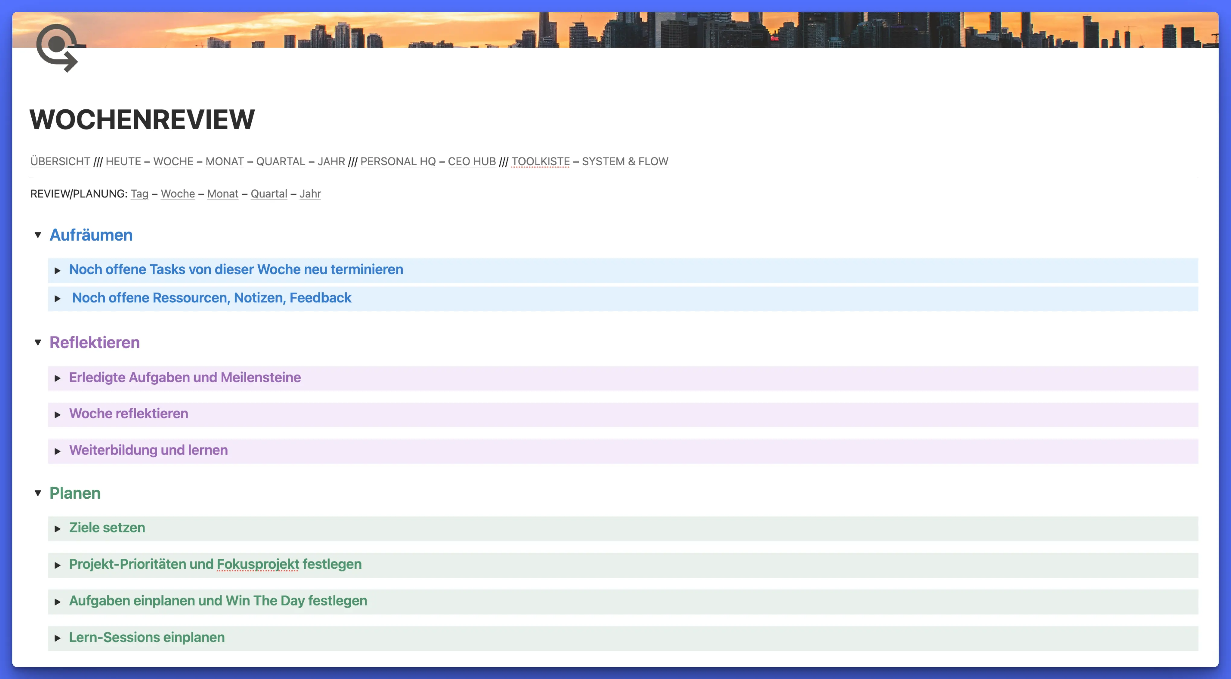 Im besten Fall machst du solche Reviews und Planungen auch für die gerade genannten Zeithorizonte: Tag, Woche, Monat und Quartal. Das Jahr würd ich an der Stelle ausklammern, weil das zum einen selten vorkommt (nämlich 1x im Jahr, haha) und zum anderen meist eh gemacht wird.